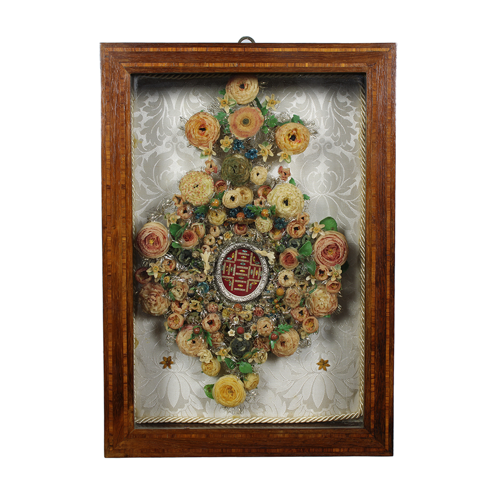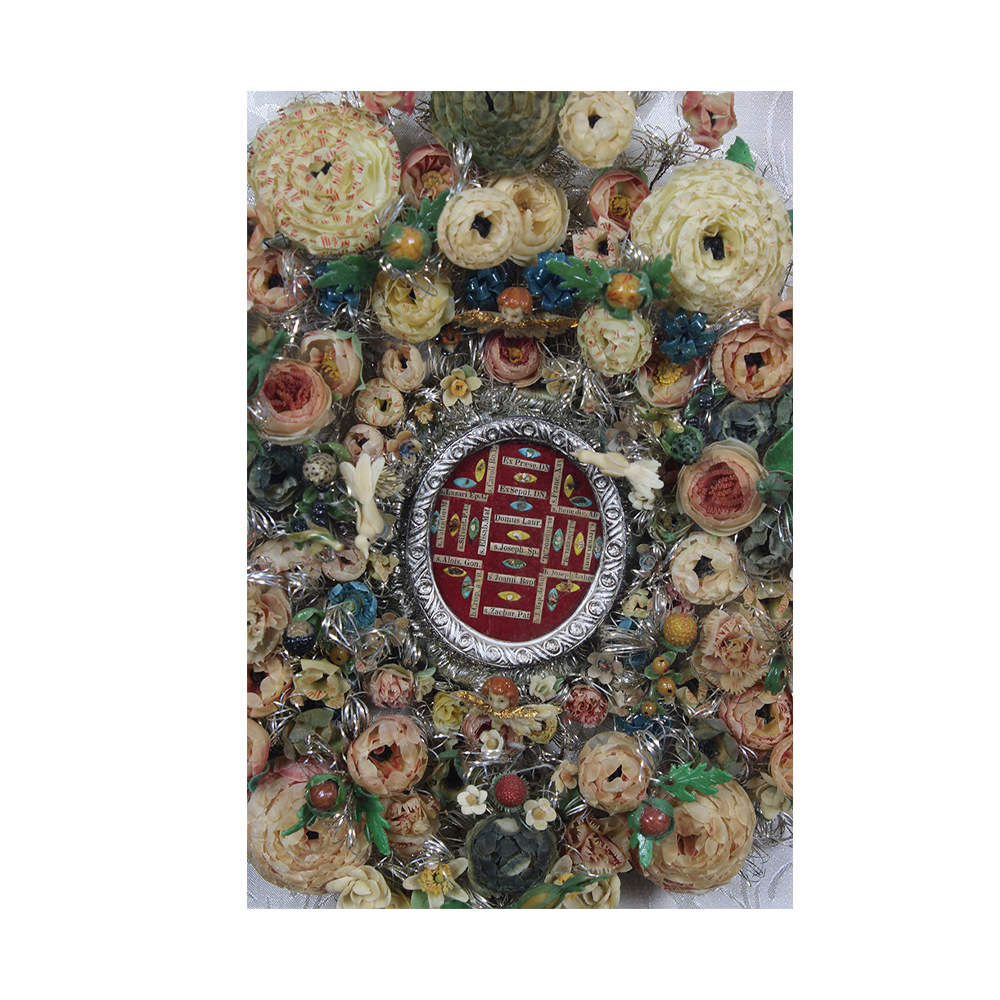 PORTA RELIQUIA arricchita da decorazioni floreali in diversi materiali dentro teca in legno di palissandro e legno rosa Sicilia XIX secolo h cm 46 x 33 x 9