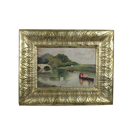 OLIO SU TAVOLETTA raffigurante barche al fiume con personaggi dentro cornice in legno scolpito a palmette dorate ad argento e mecca Sicilia XIX secolo h cm 17 x 24,5 - cornice h cm 31 x 39