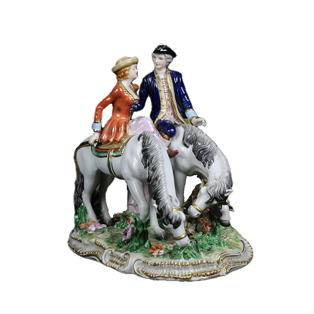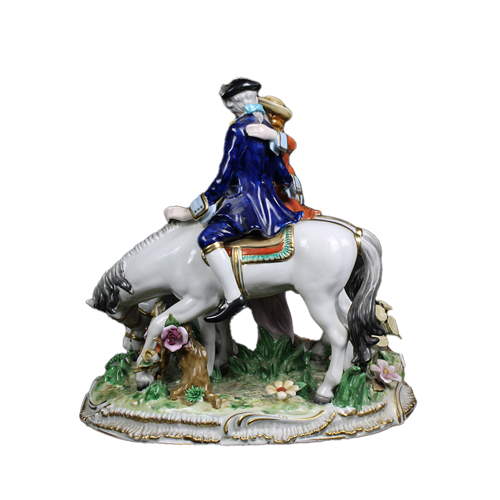 GRUPPO in porcellana policroma raffigurante innamorati a cavallo manifattura VFC collection XX secolo h cm 33 x 32 x 22