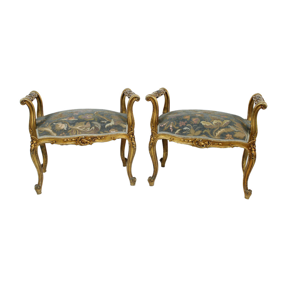 COPPIA SGABELLI in legno scolpito e dorato con seduta imbottita in stoffa maestranze siciliane XIX/XX secolo h cm 66 x 76 x 45