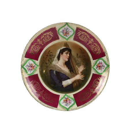 PIATTO in porcellana dipinta in policromia e lumeggiature in oro dentro riserva raffigurante ritratto di arpista manifattura Vienna XIX secolo cm A 25