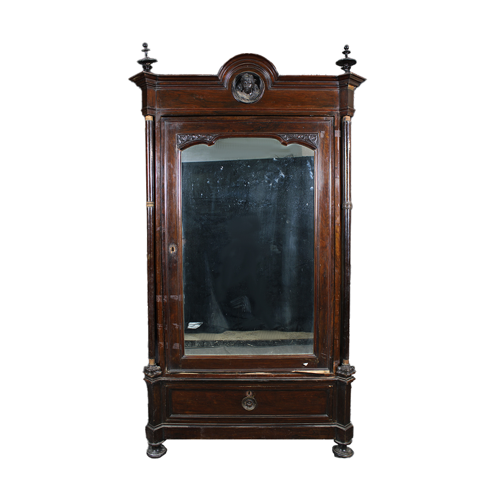 ARMADIO in palissandro ad 1 anta a specchio con cassetto nella parte inferiore sulla cimasa scultura finemente intagliata raffigurante figura femminile Sicilia XIX secolo h cm 238 x 122 x 63