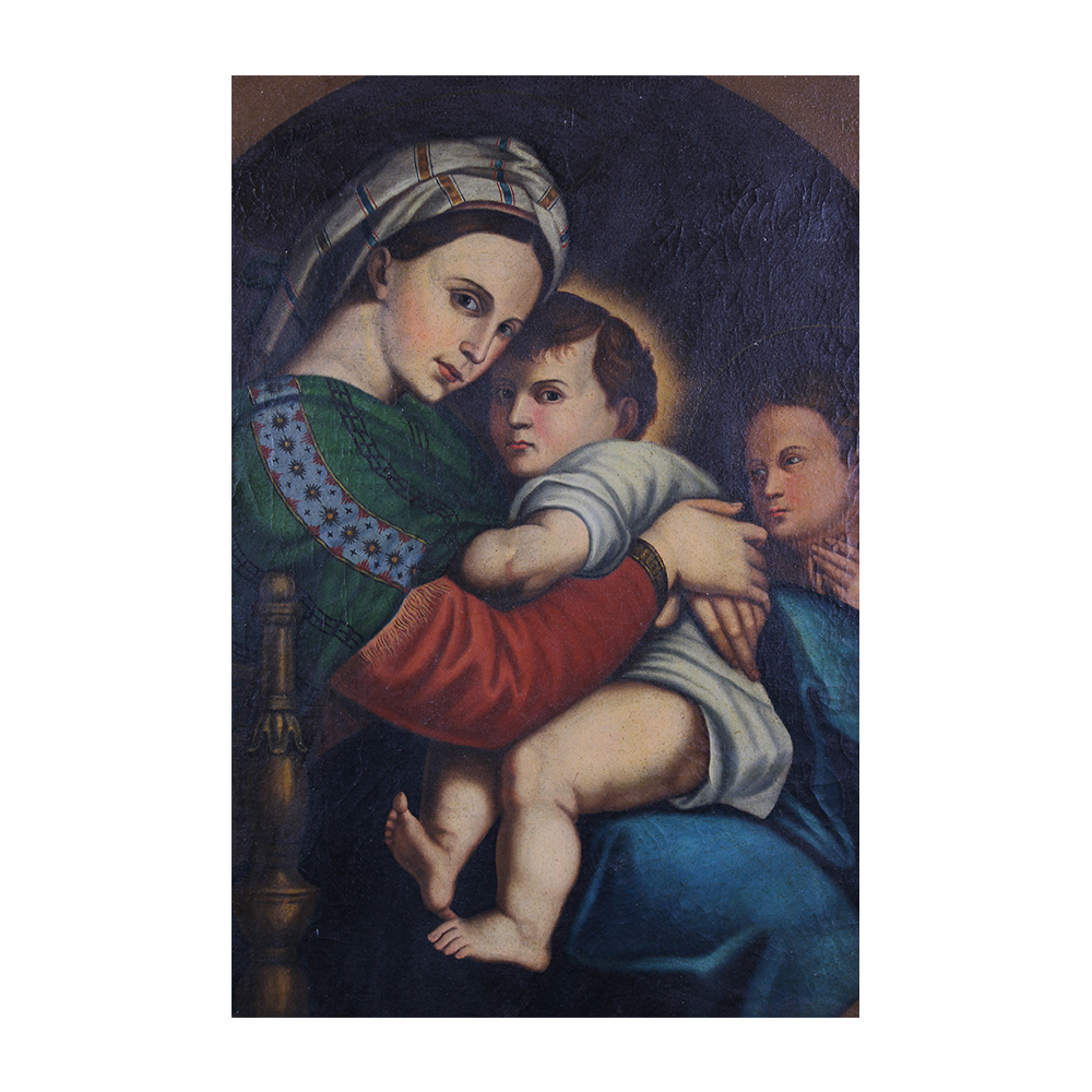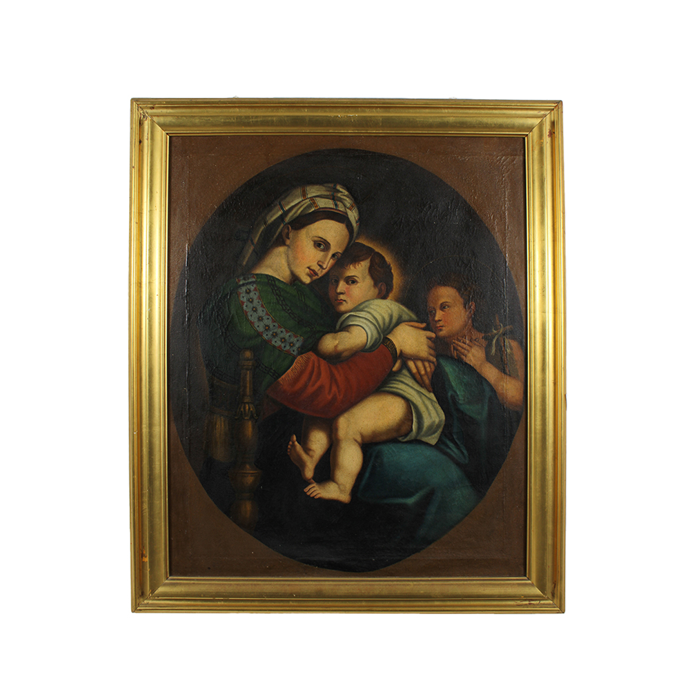 OLIO SU TELA raffigurante La Madonna sulla seggiola copia da Raffaello dentro cornice in legno dorato XIX/XX secolo h cm 95 x 75 - cornice 110 x 93
