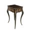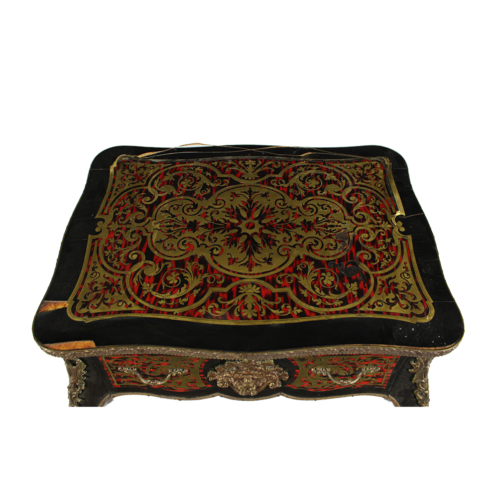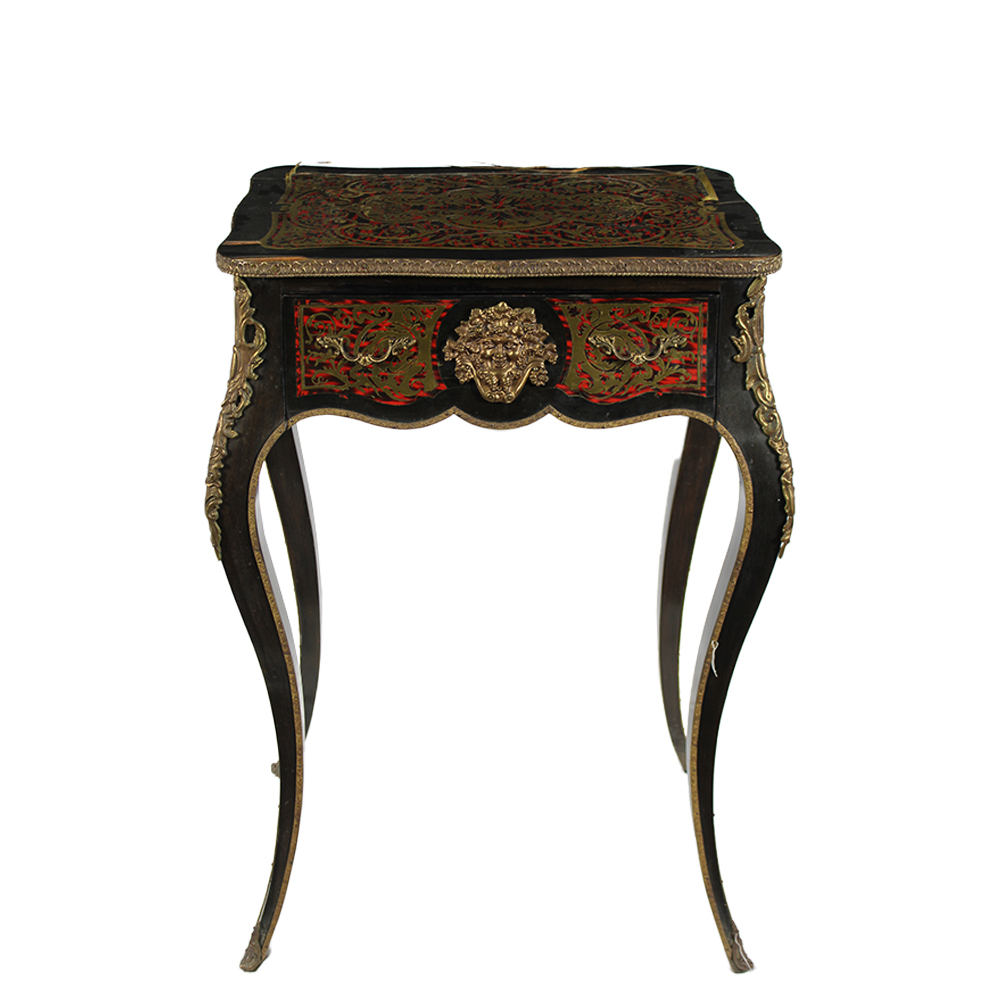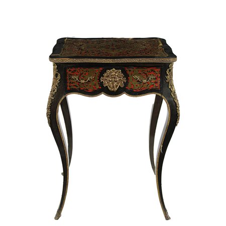 TAVOLINO DI GUSTO BOULLE in legno ebanizzato con tarsie in ottone e materiale pregiato in finta tartaruga arricchita da applicazioni in bronzo con cassetto manifattura francese primi 900 h cm 82 x 53 x 38