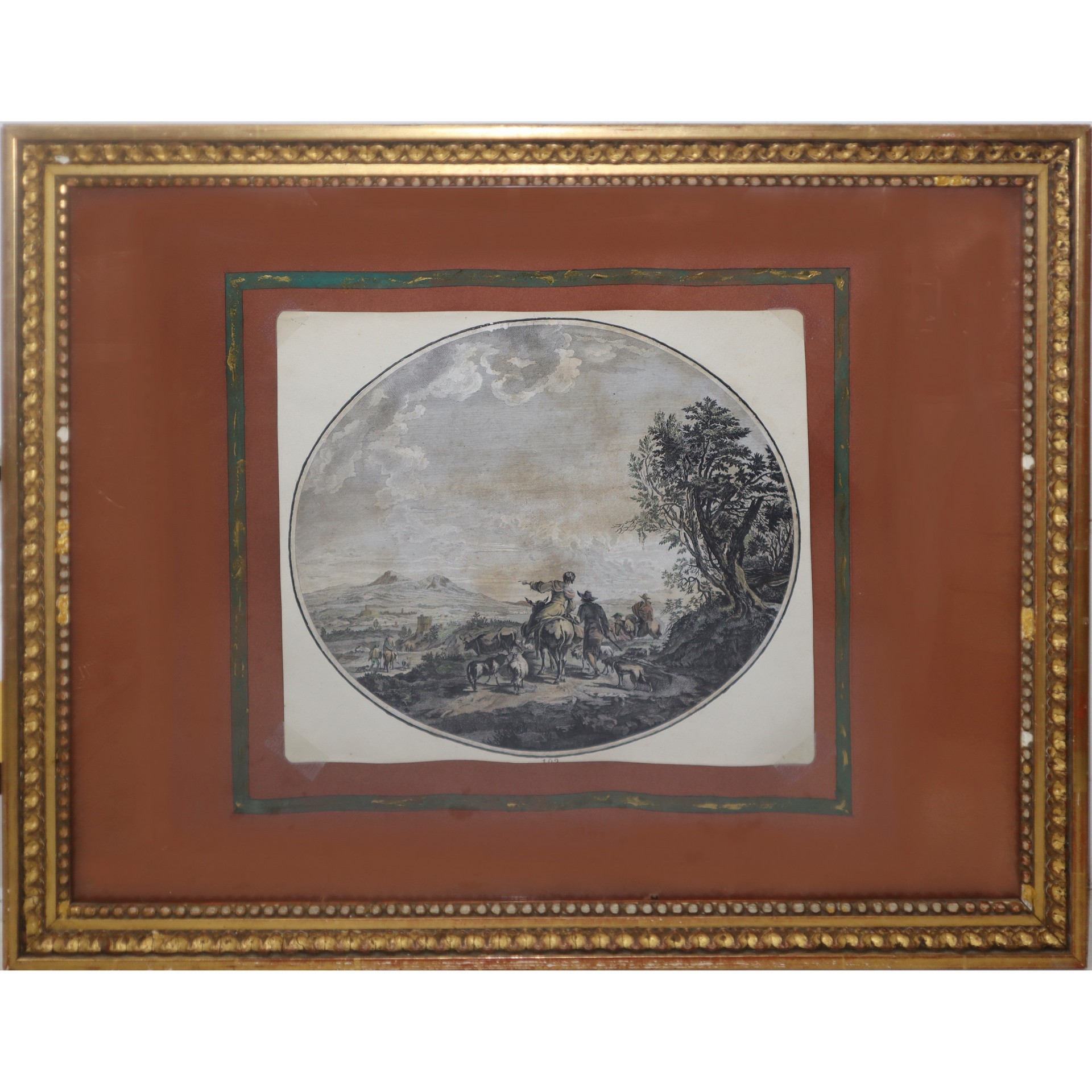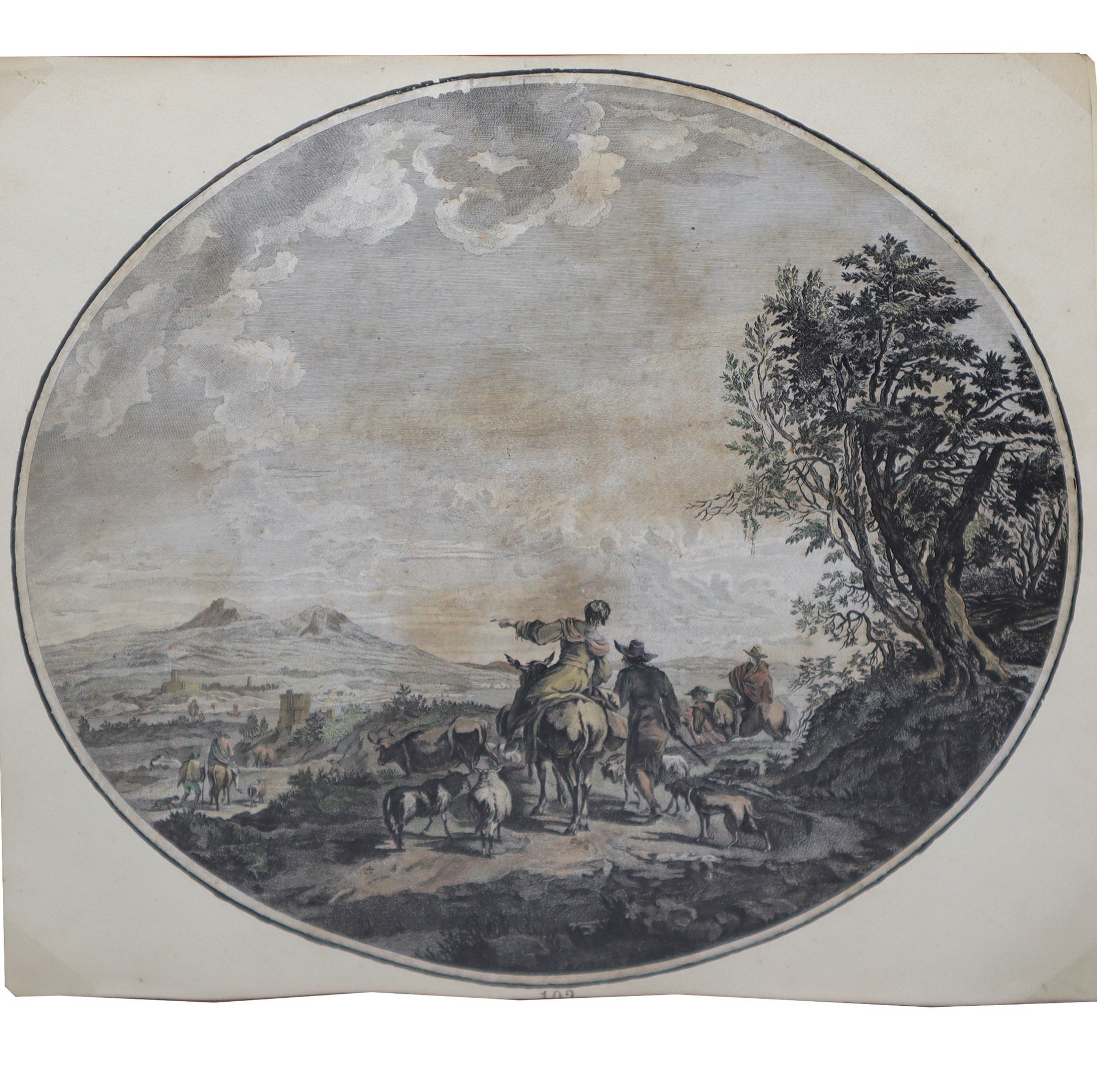 Pastori con armenti in paesaggio con alberi, 17th century MM 290 x 334, in cornice cm 55 x 70 Incisione all'acquaforte acquarellata ovale