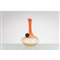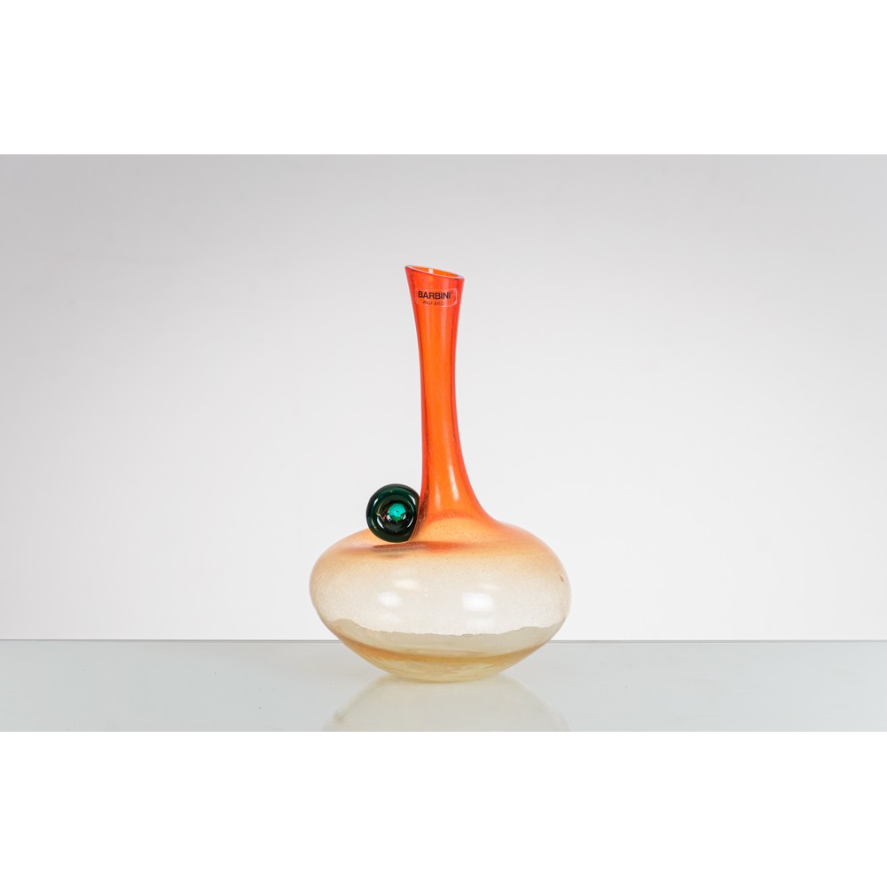 Vaso in vetro a sfumare parzialmente pagliesco e rosso, corpo globulare informe con lungo collo e bocca piana inclinata, presa in vetro verde. Etichetta e firma.