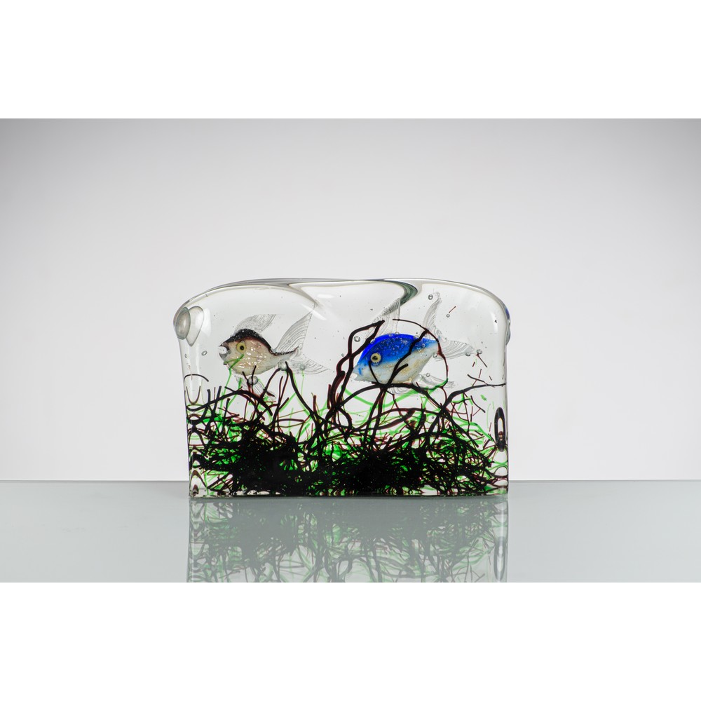 Acquario in vetro blocco incolore che ingloba due pesci policromi.