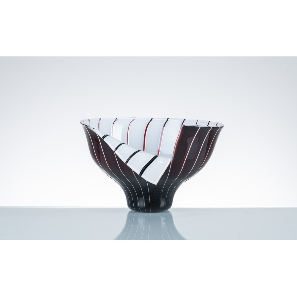 Coppa serie "Spacchi" in vetro soffiato con decoro di fasce lattimo e nere. Firma a punta Barovier & Toso murano.
