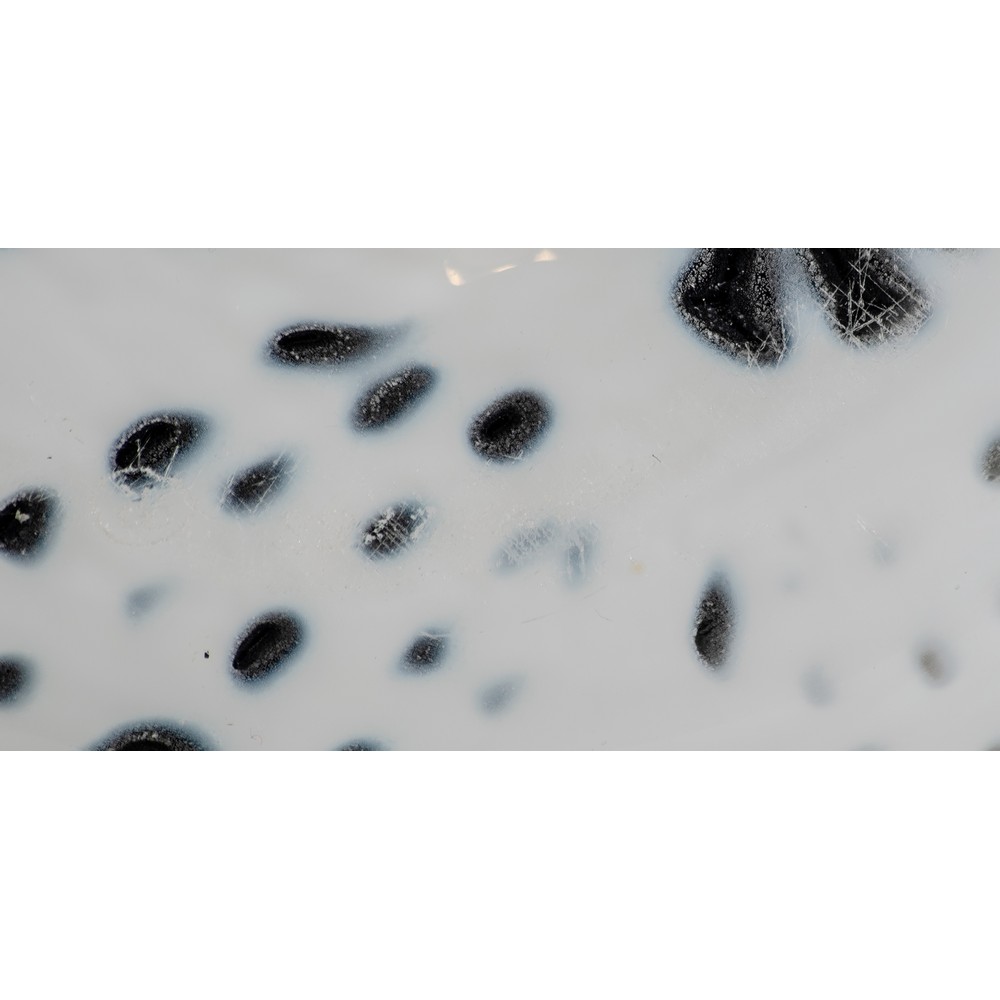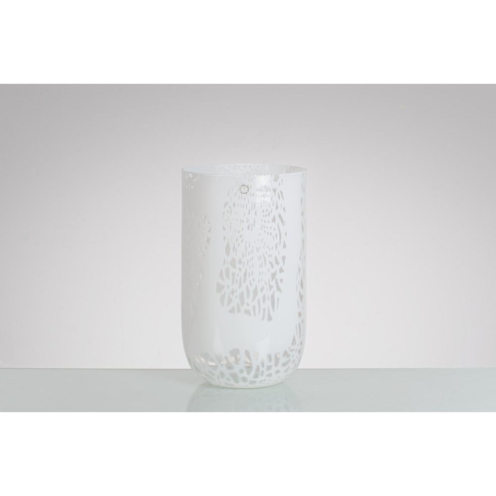 Vaso in vetro soffiato della serie "Merletti" con decori in vetro lattimo a disegni astratti traforati, corpo cilindrico con bocca piana circolare. Firma a graffio, data e vecchia etichetta.