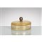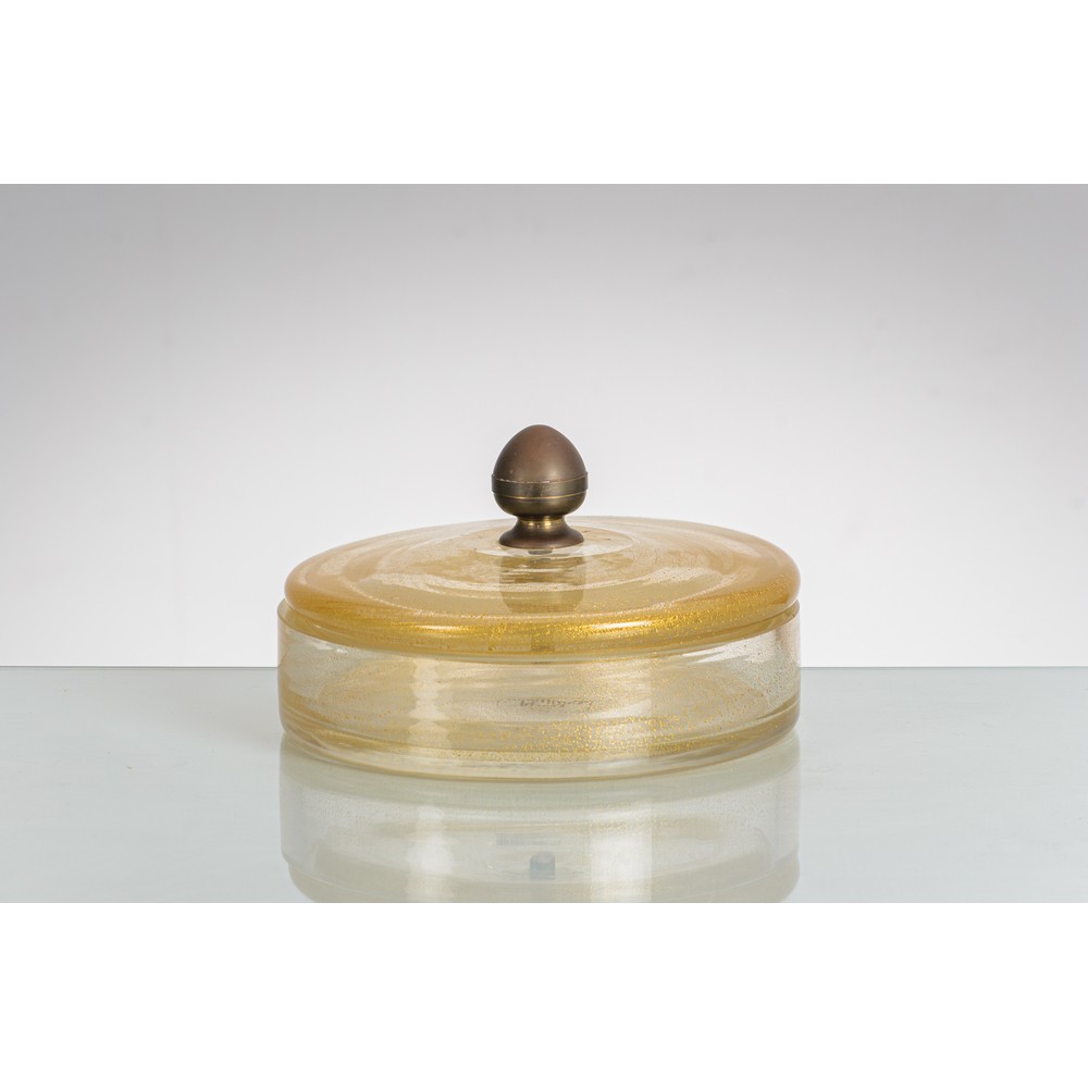Scatola con coperchio in vetro trasparente con inclusioni oro, corpo circolare, presa a pigna in ottone. Etichetta di produzione.