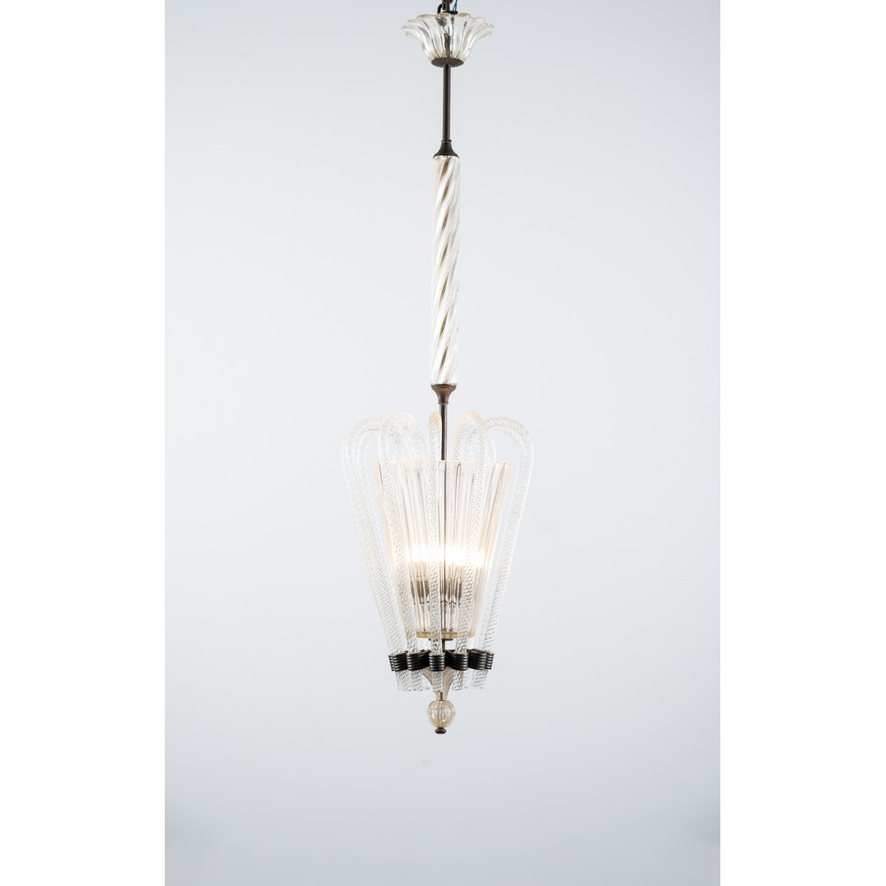 Lampada a sospensione a tre luci, struttura in ottone, diffusore in vetro incolore pagliesco e contornato da cannucce in vetro incolore tortili. Una cannuccia mancante.