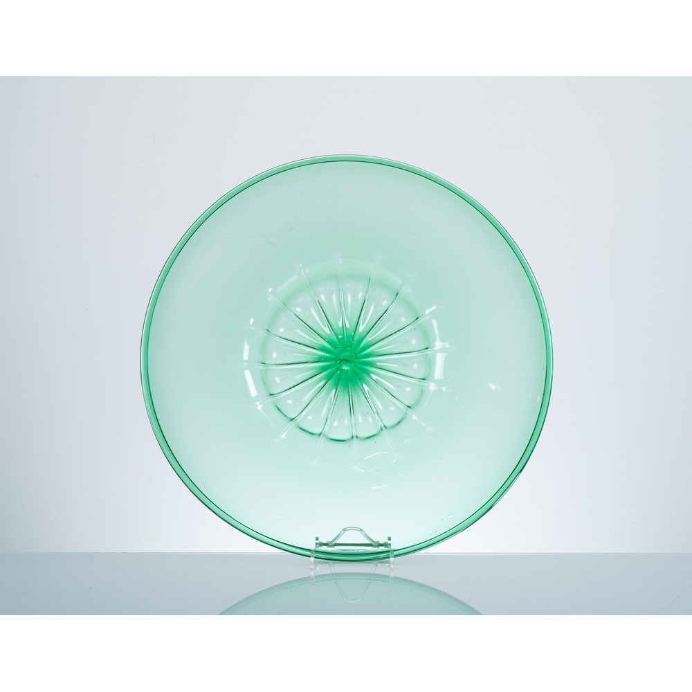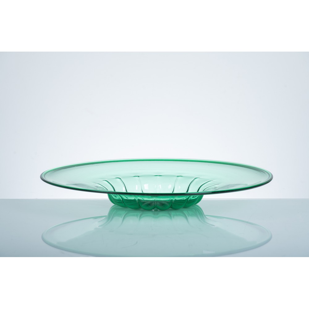 Piatto in vetro soffiato trasparente verde corpo circolare con fondo baccellato a larghe costole.