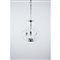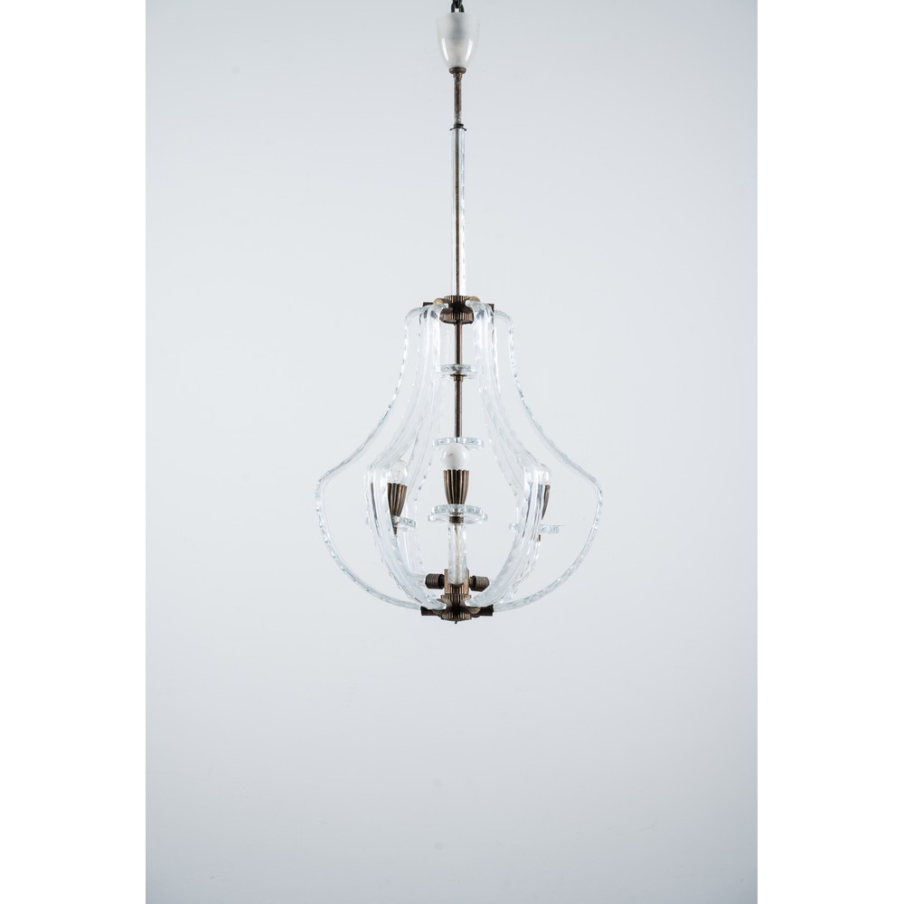 Lampada a sospensione a tre luci, struttura in ottone, diffusore in vetro incolore sagomato e molato.