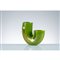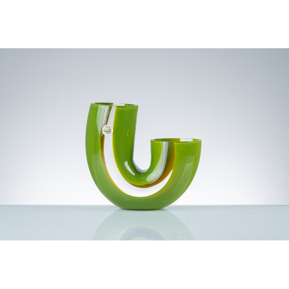 Vaso a due bocche in vetro verde decorato con due fasce laterali in vetro incolore. Corpo cilindrico curvato con due bocche circolari piane. Etichetta di produzione.