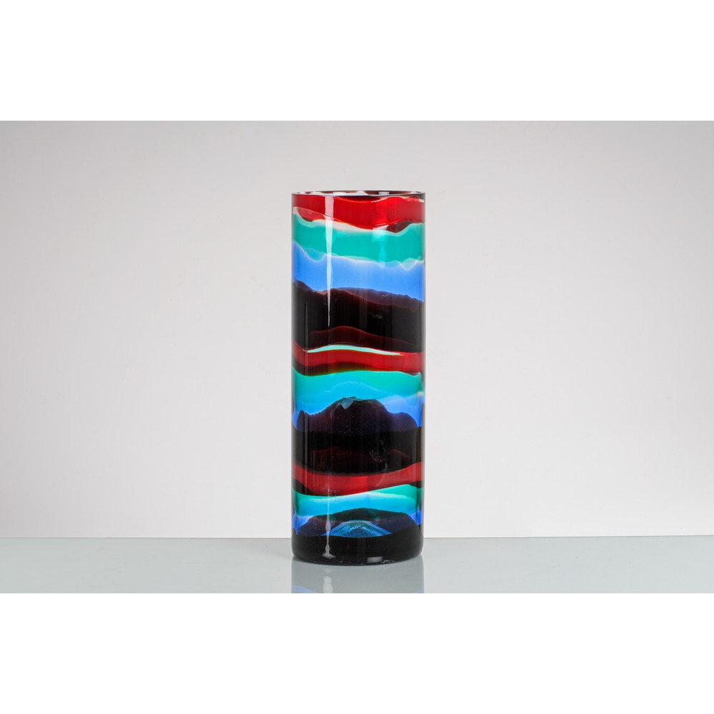 Vaso a “Fasce Orizzontali” in vetro soffiato e vetro applicato con fasce rosse, verdi, blu zaffiro e toni di sovrapposizione, corpo cilindrico con bocca piana circolare. Timbro all’acido per la produzione 1955-59 “Venini Murano Italia”.