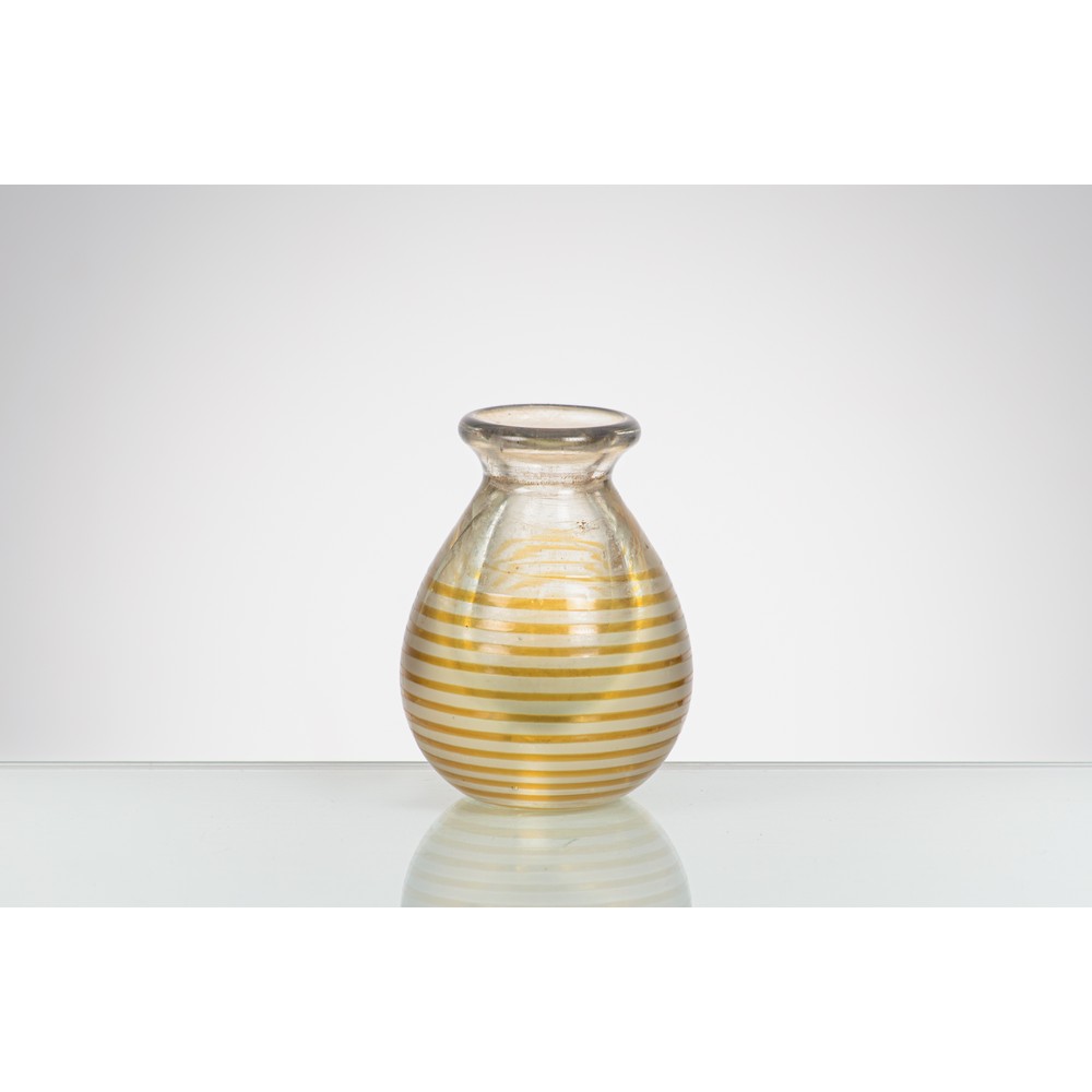 Bottiglia in vetro trasparente con decoro a spirale in vetro giallo, vetro opaco tra le rigature. Due filè laterali.