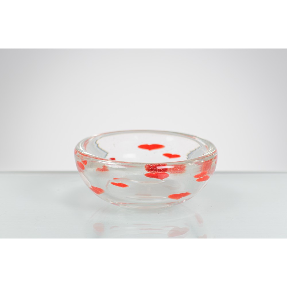 Coppa a “Puntini” in cristallo incolore e punti in pasta vitrea rossa, corpo semi globulare. Presentato alla mostra Internazionale di Parigi. Firma all'acido alla base Venini, Murano.