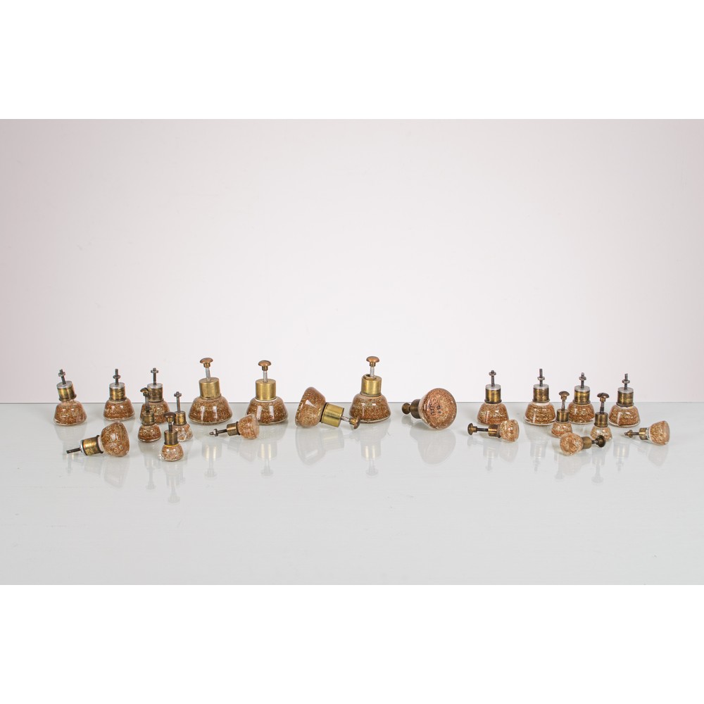 Ventidue maniglie a pomello di grandezza differente in ottone e vetro incolore e ruggine, corpo tronco conico. Qualche difetto.