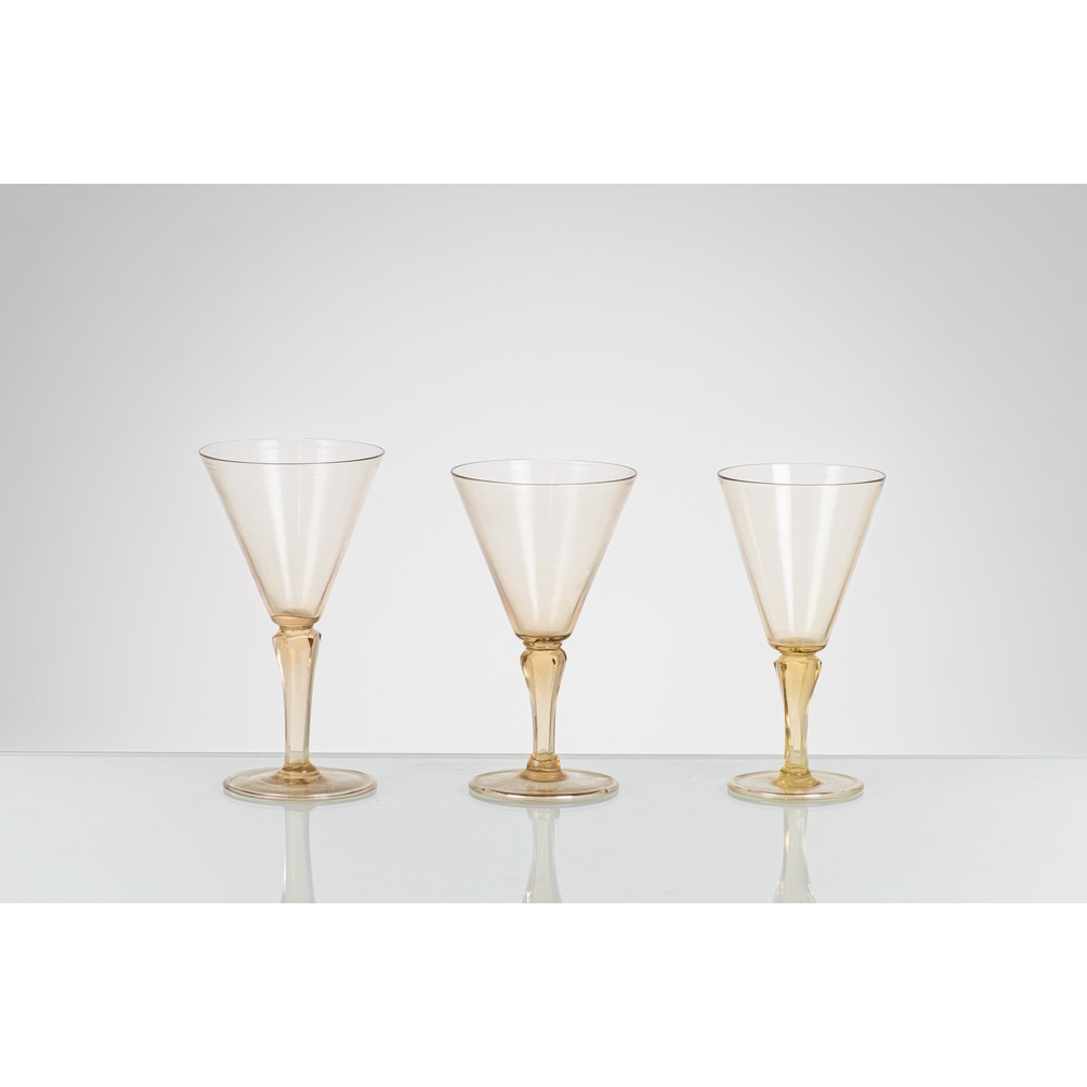 Tre bicchieri modello “Ambasciata” in vetro soffiato pagliesco, coppa conica con bocca piana circolare, stelo a goccia.