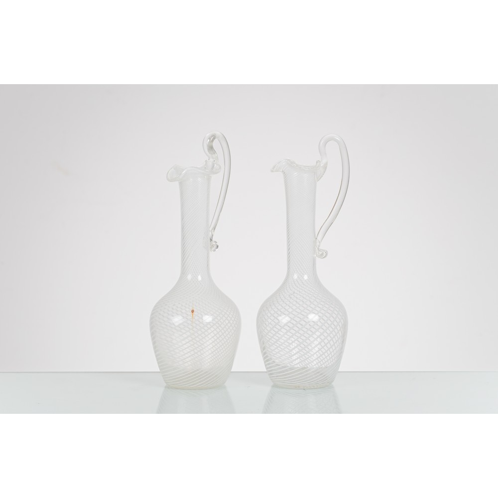 Coppia di caraffe in vetro soffiato a filigrana lattina, manico ricurvo.