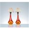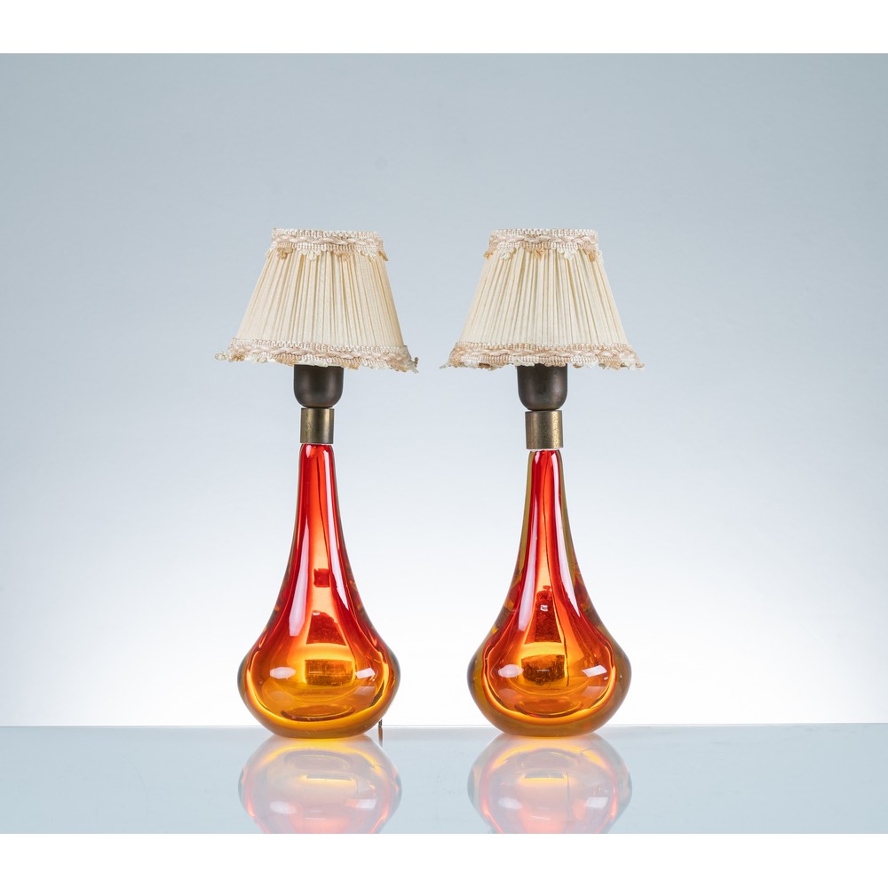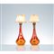 Coppia di lampade da tavolo ad una luce, corpo a goccia in vetro sommerso rosso ed arancione, ottone, diffusori in tessuto avorio.