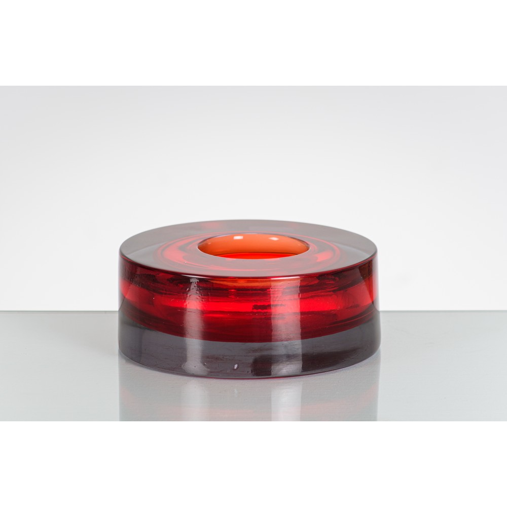 Porta candela in vetro sommerso rosso, corpo circolare con bocca piana.