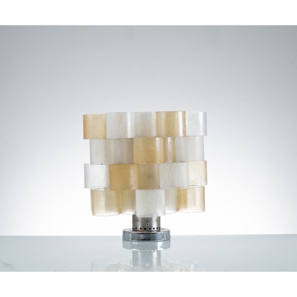 Lampada da tavolo ad una luce modello “Globula”, struttura in metallo cromato, diffusore composto da anelli cilindrici sovrapposti in vetro bullicante incolore e pagliesco.