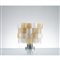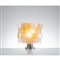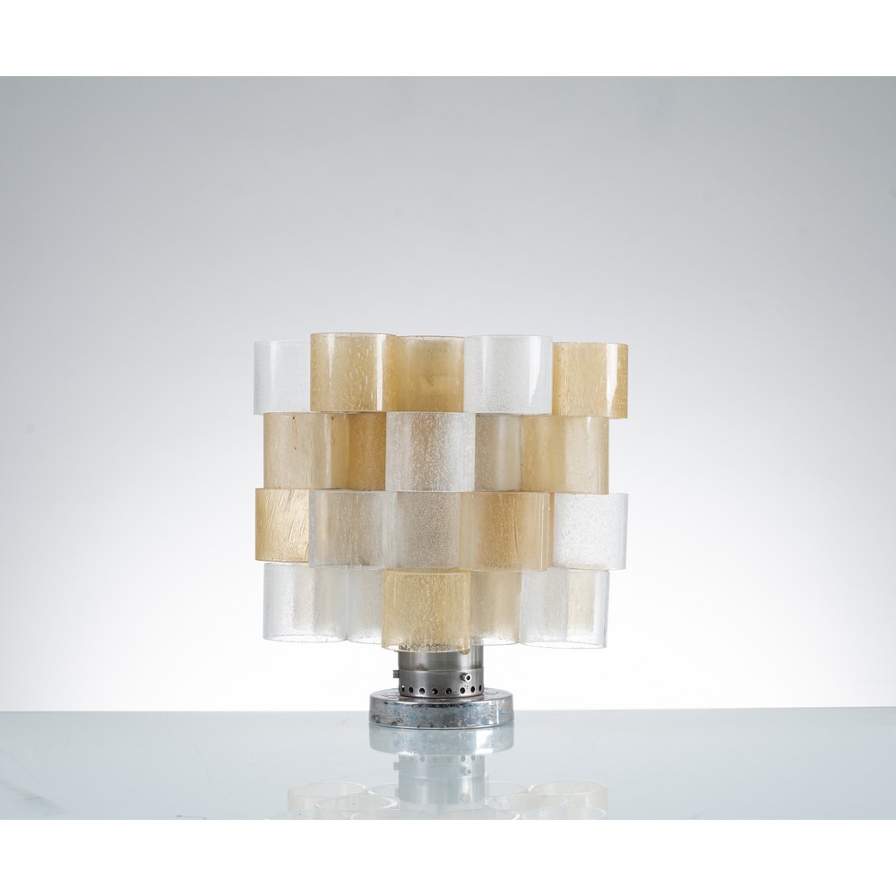 Lampada da tavolo ad una luce modello “Globula”, struttura in metallo cromato, diffusore composto da anelli cilindrici sovrapposti in vetro bullicante incolore e pagliesco.