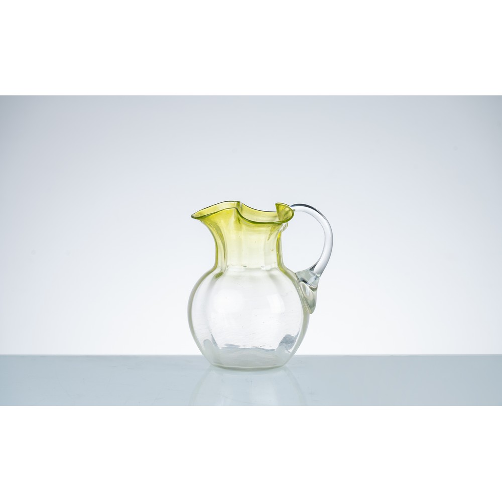 Brocca in vetro soffiato incolore sfumato verde, corpo globulare con bocca ondulata. Manico incolore. Filè al collo.