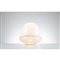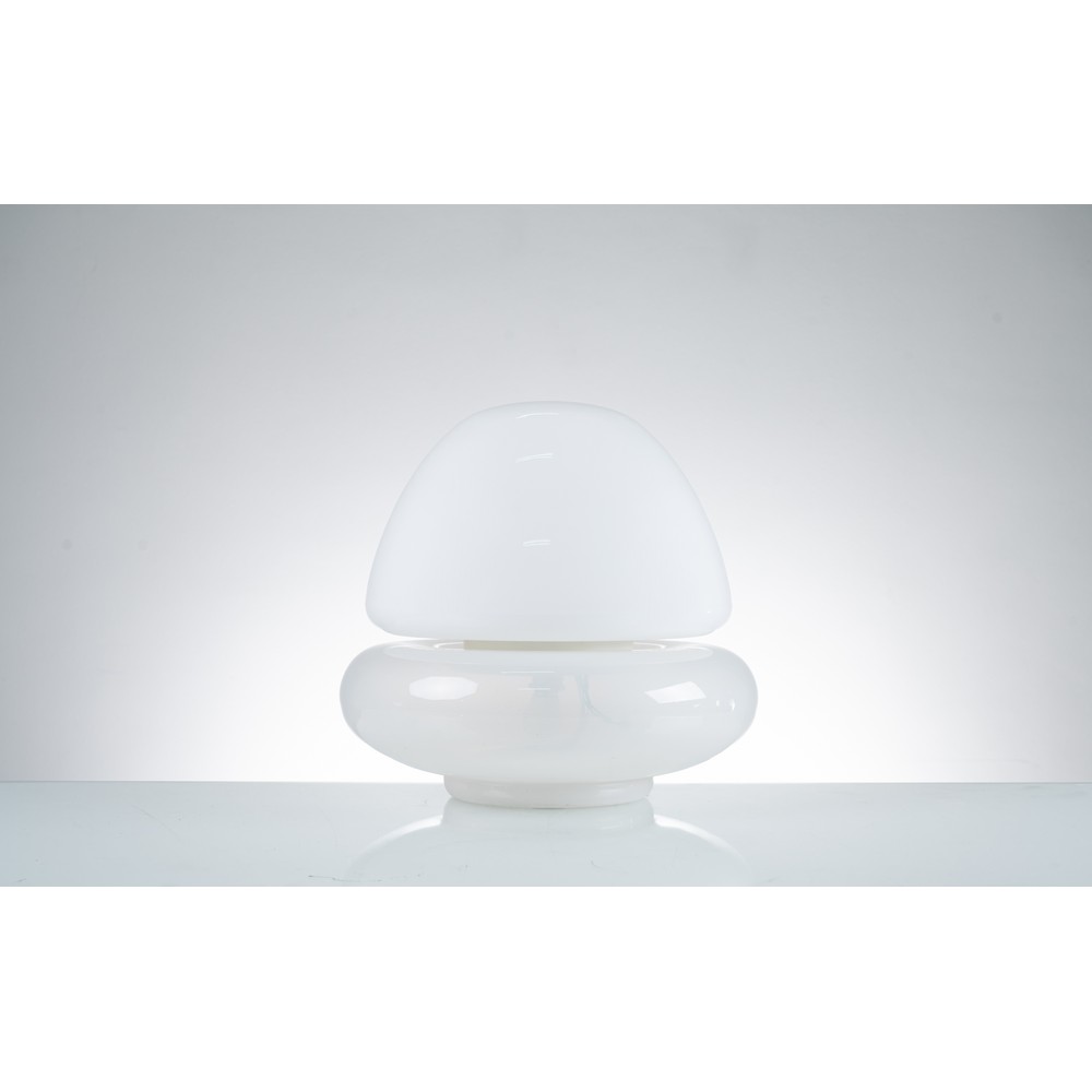 Lampada da tavolo a due luci, con struttura in metallo verniciato, diffusore in vetro lattimo composto da due elementi geometrici sovrapposti.