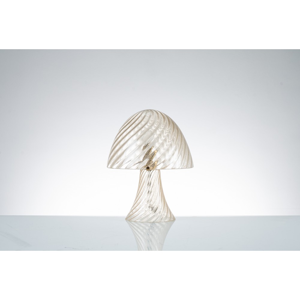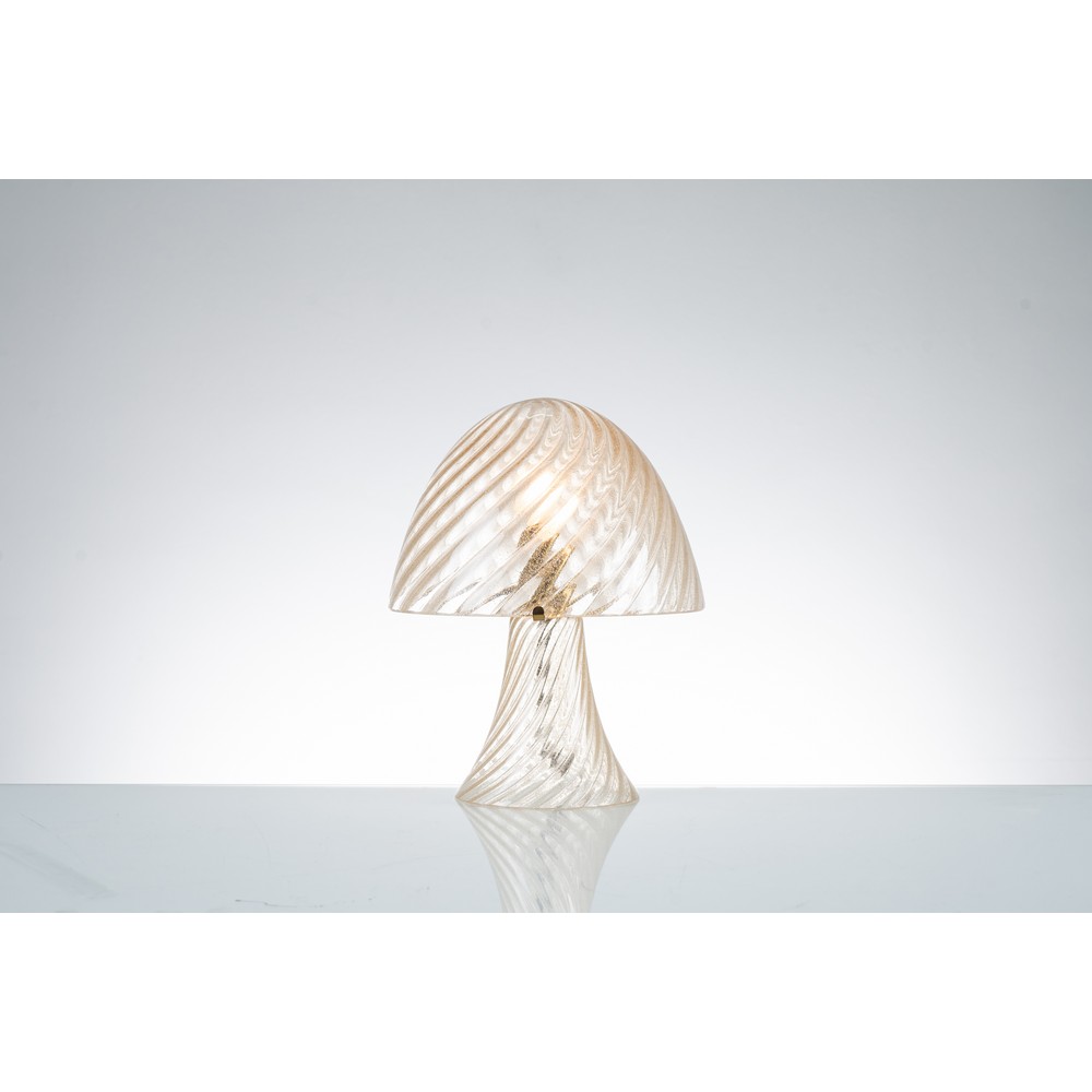 Lampada da tavolo ad una luce modello “Mushroom”, struttura in vetro pulegoso e oro con lavorazione a spirale, diffusore semisferico, sostegni in metallo dorato.