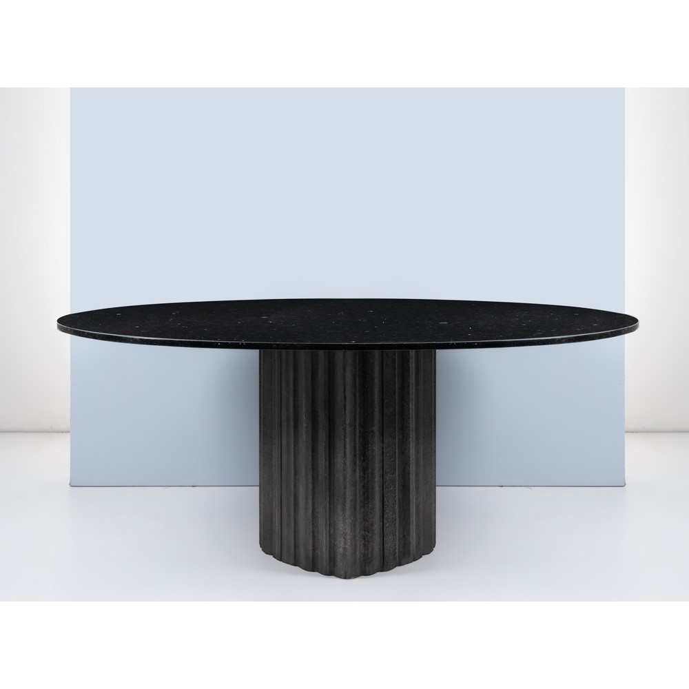 Tavolo da pranzo con base ellittica in alluminio ondulato, piano ovale in marmo granito nero. Firma sulla base.