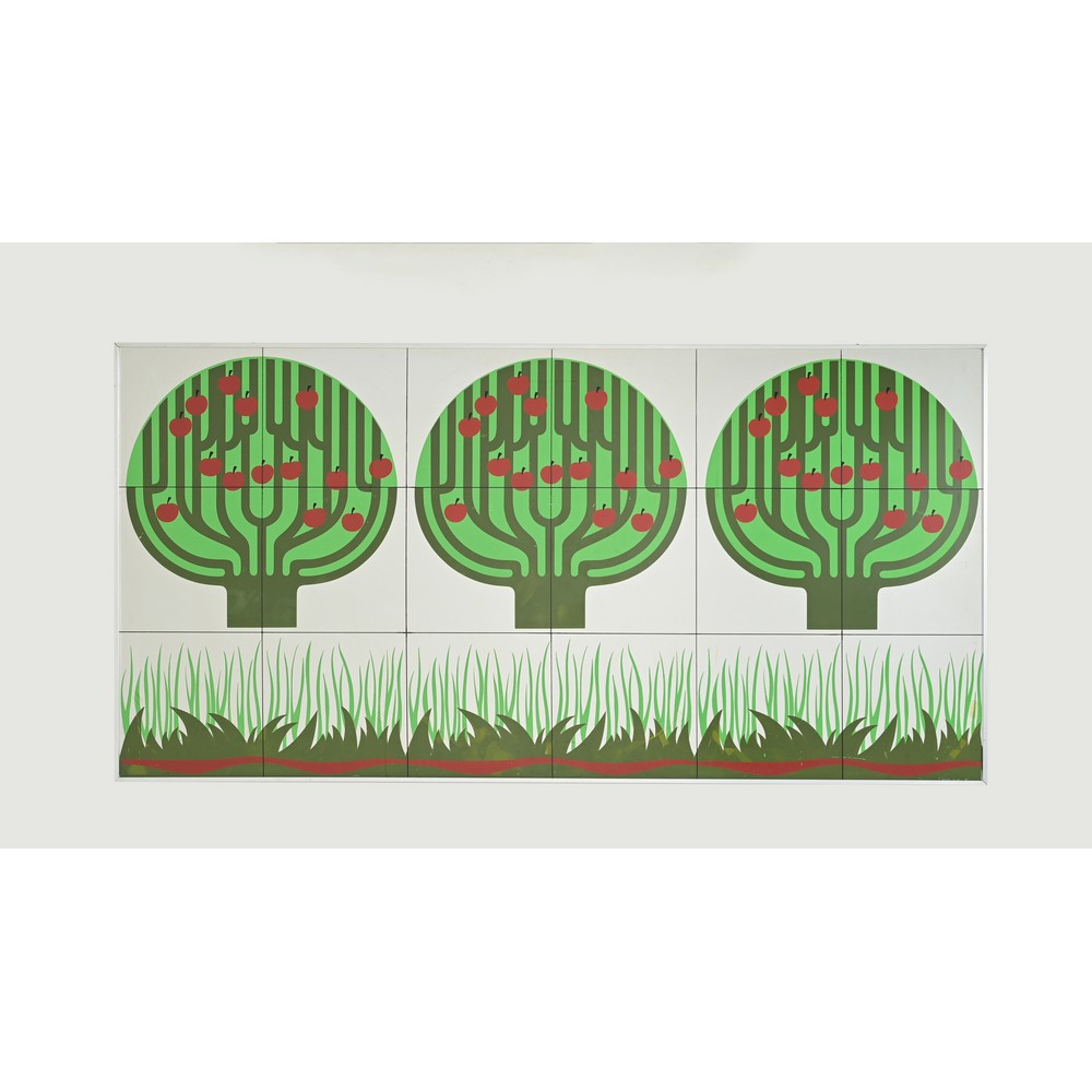 Pannello rettangolare composto da diciotto formelle in alluminio decorate con alberi da frutto, opera del 1976, firmata e numerata.