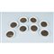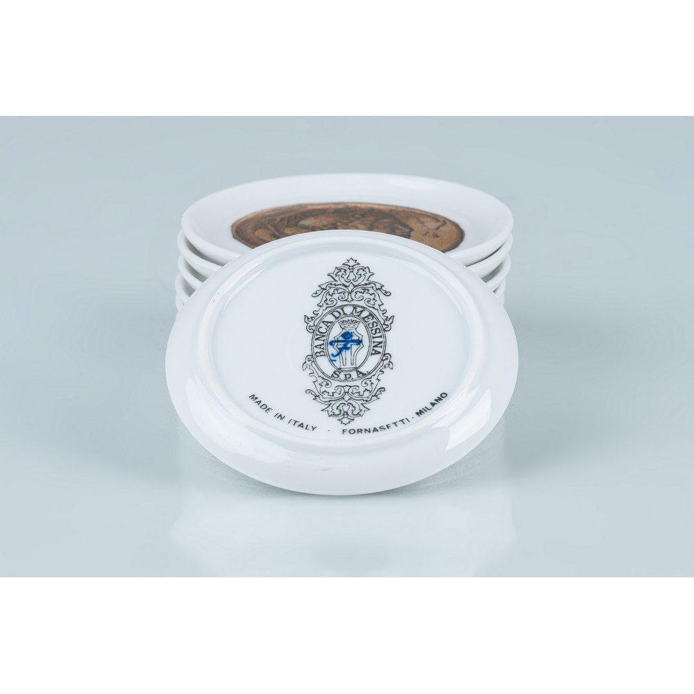 Otto piatti della serie “Monete Romane” in ceramica serigrafata in nero e oro raffiguranti antiche monete. Segni di uso. Marchio di produzione. Contenitore originale.