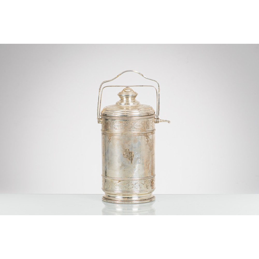 Porta ghiaccio termico in argento sterling 925, corpo cilindrico con decori a cesello su fasce continue di alloro intrecciato, monogramma sul fronte, impugnatura sagomata. Peso g. 1520 (netto), con termos g. 2554 (lordo). Marchio e titolo argento incussi sul fondo.