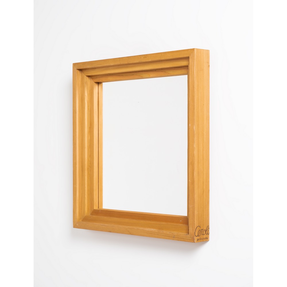 Specchio da parete quadrato modello “SP60” della serie Mobili nella Valle, con struttura in legno e cristallo specchiato Marchio a fuoco.