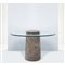Tavolo da pranzo modello “Castore” in marmo grigio venato di bianco, piano circolare in vetro trasparente, vassoio in marmo.