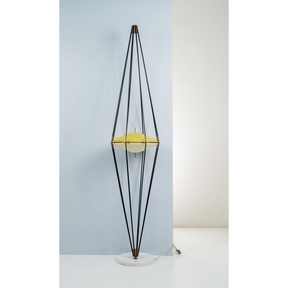 Lampada da terra a due luci modello “12628” detto “Siluro”, struttura in metallo verniciato nero, diffusore a disco a circolare in plexiglass colorato, base circolare in marmo bianco di Carrara. Etichetta e marchio di produzione.