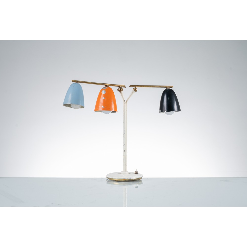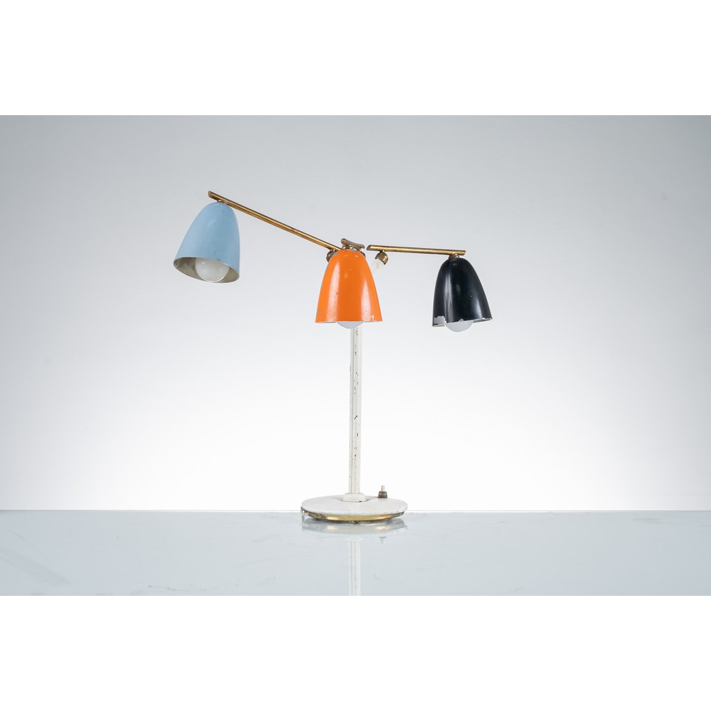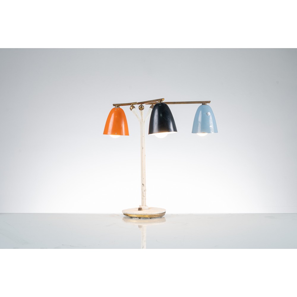 Lampada da tavolo a tre luci con struttura in metallo verniciato bianco, ottone, diffusori a campana in metallo verniciato celeste, arancione e nero. Vernice originale, segni di usura e lievi difetti.