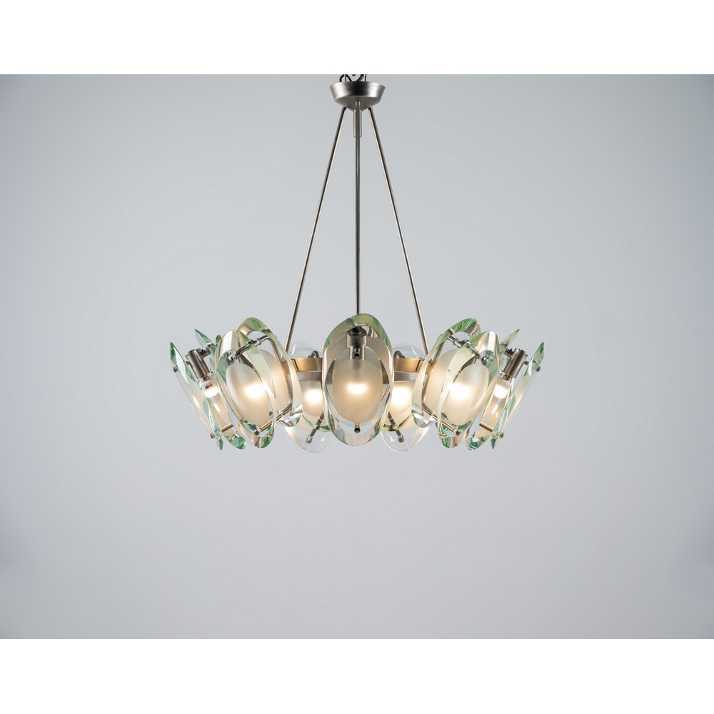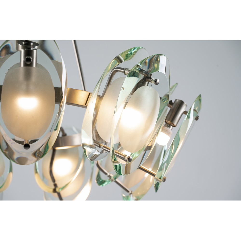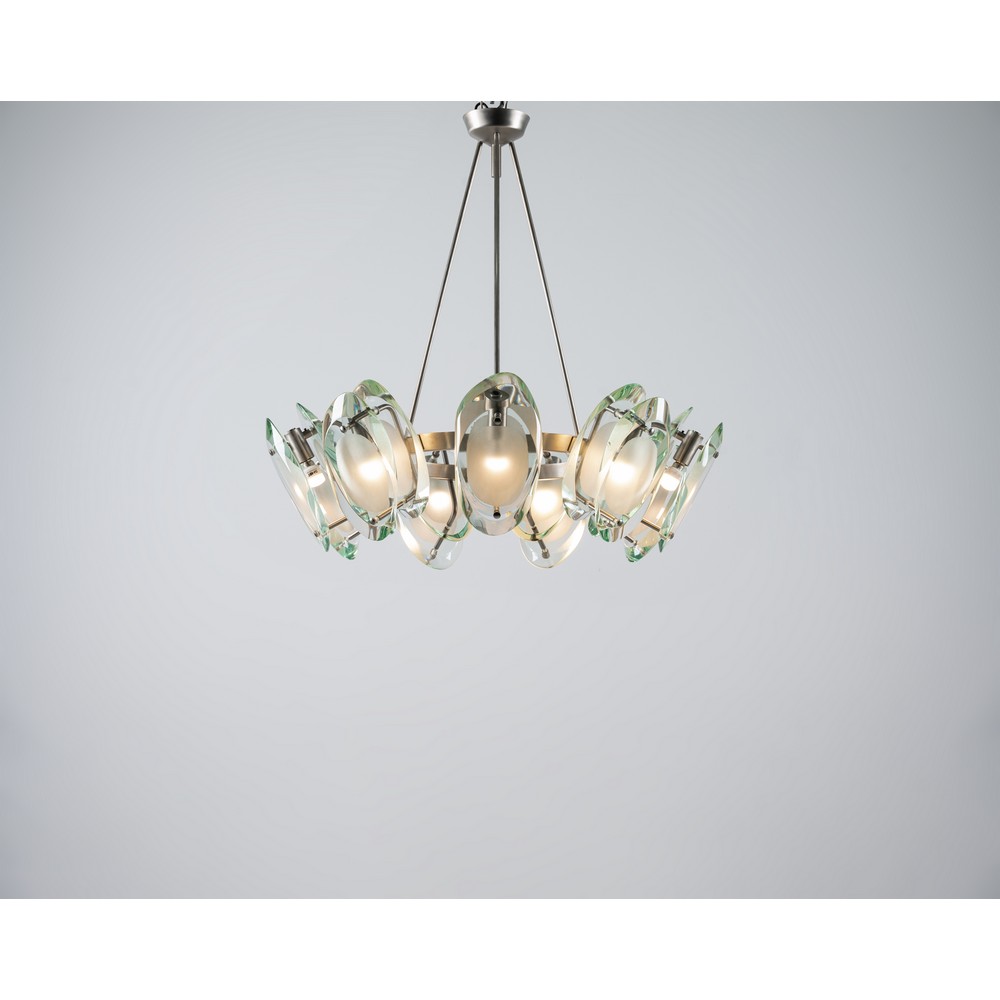 Lampada a sospensione a nove luci modello “2088”, struttura in ottone nichelato, diffusori composti ciascuno da due cristalli sagomati, molati e parzialmente sabbiati.