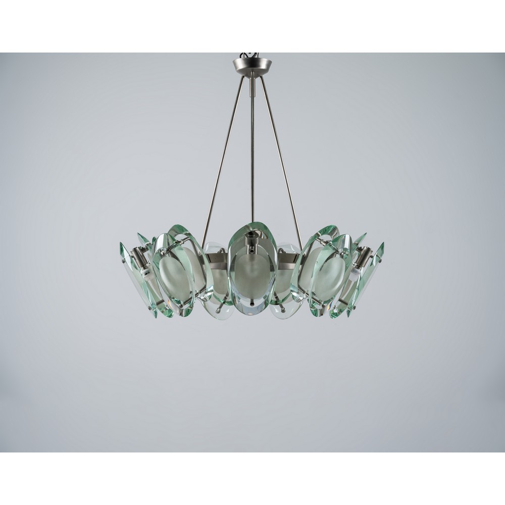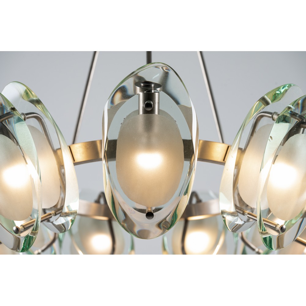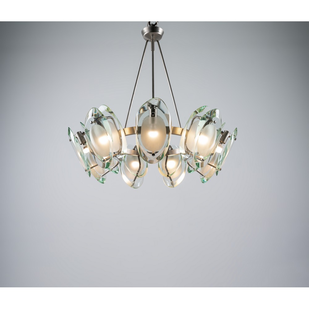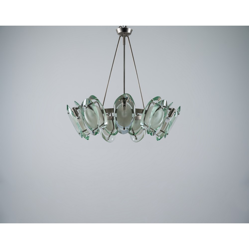 Lampada a sospensione a nove luci modello “2088”, struttura in ottone nichelato, diffusori composti ciascuno da due cristalli sagomati, molati e parzialmente sabbiati.