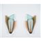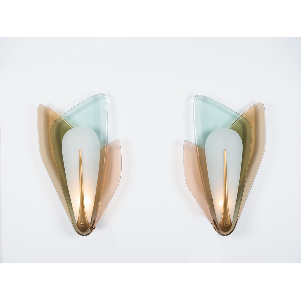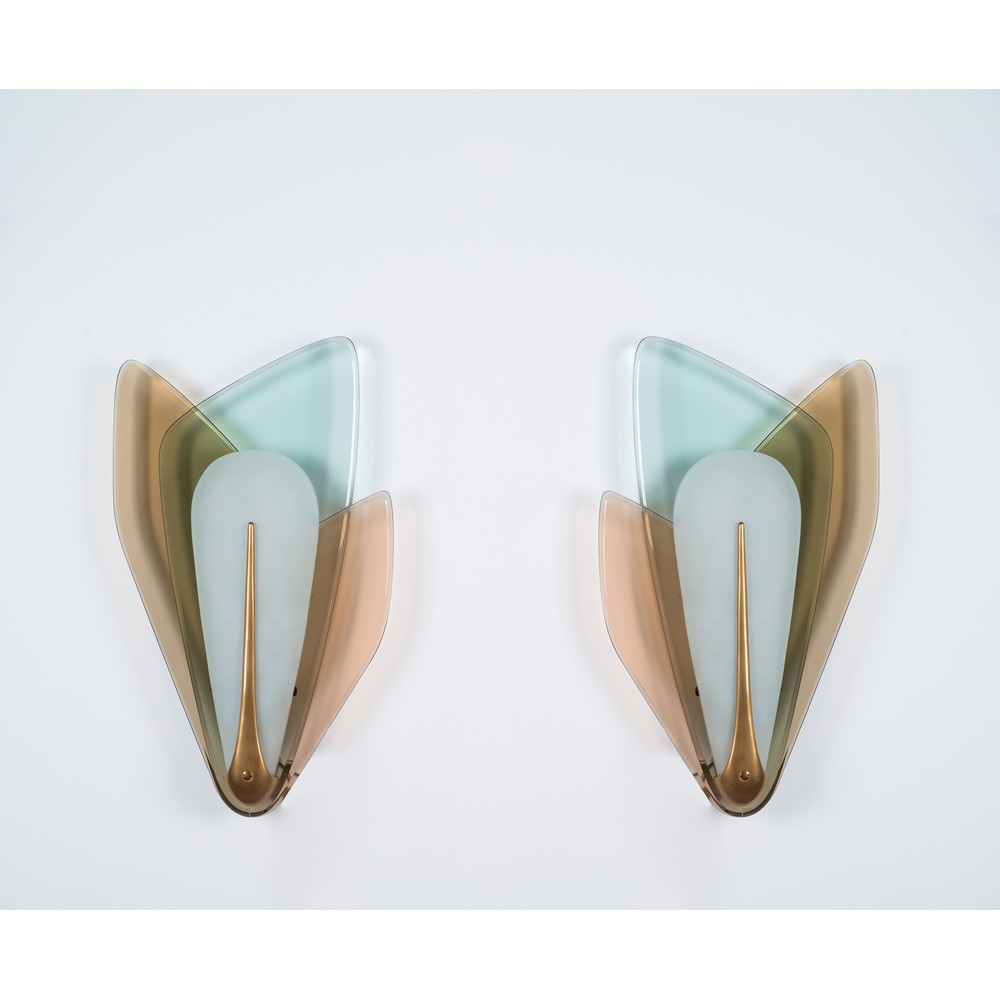 Coppia di lampade da parete ad una luce in cristallo sagomato rosato, verde e bronzo, diffusore curvo in cristallo satinato, ottone.