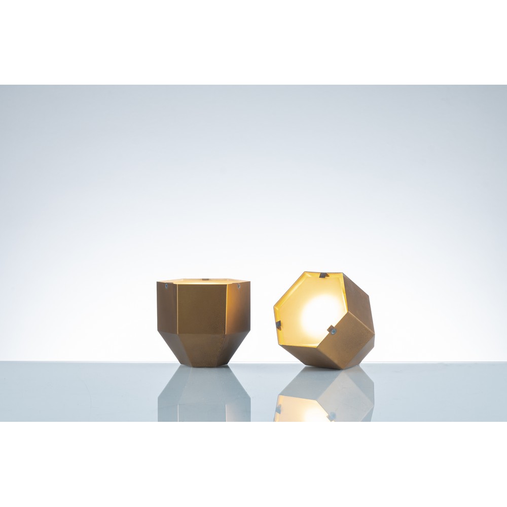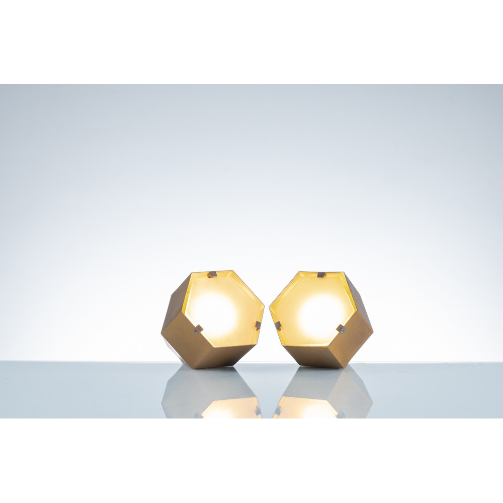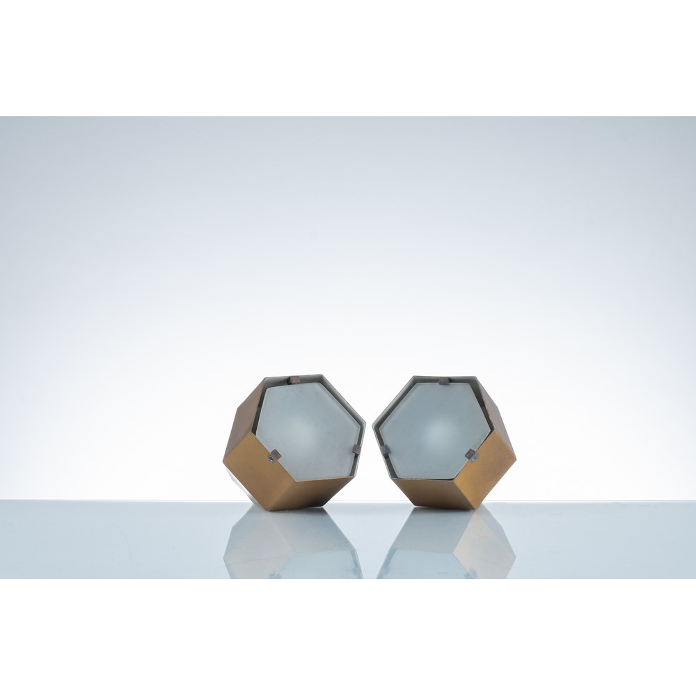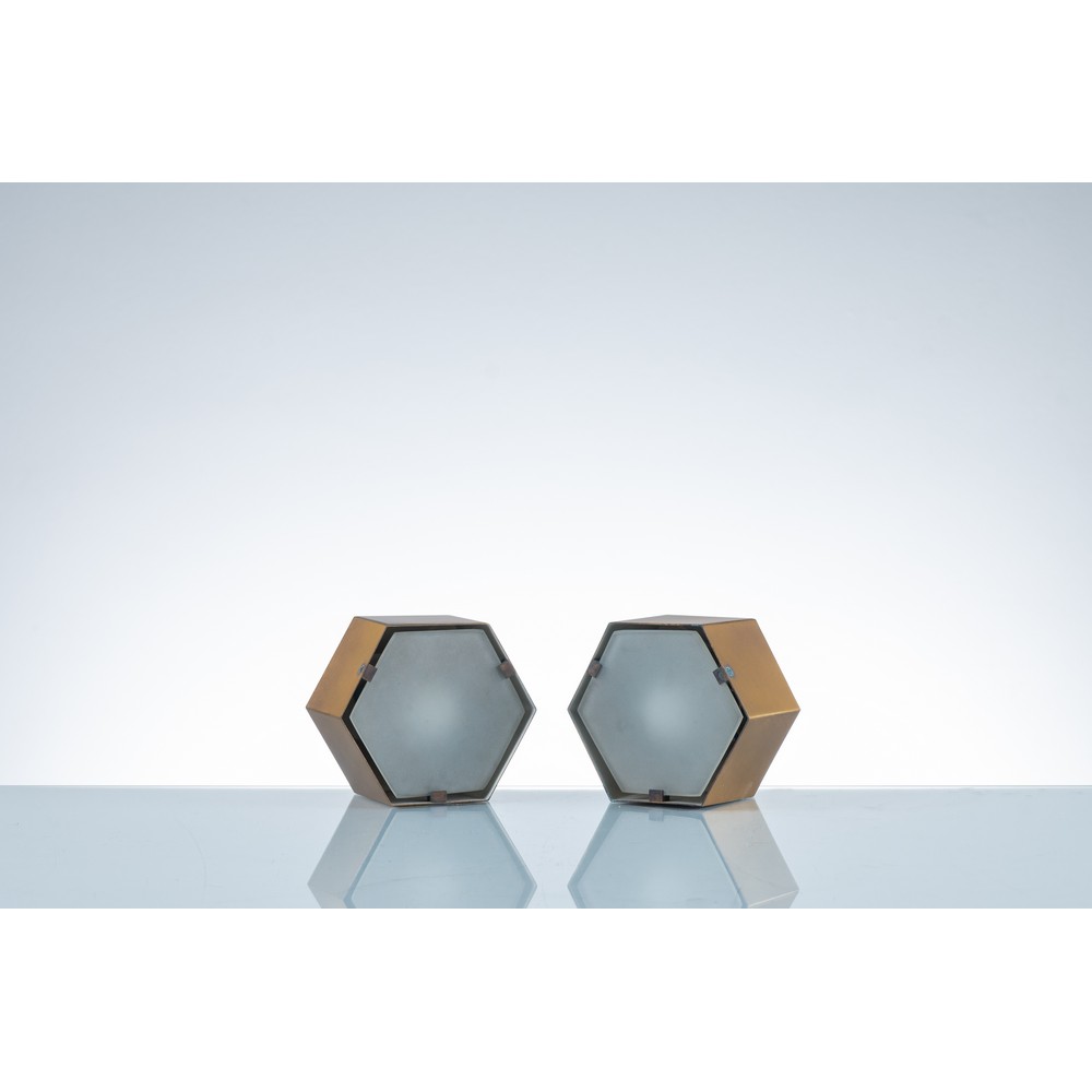 Coppia di lampade da tavolo ad una luce modello “2202”, struttura esagonale in ottone con diffusore in vetro satinato.
