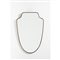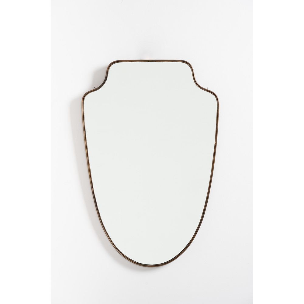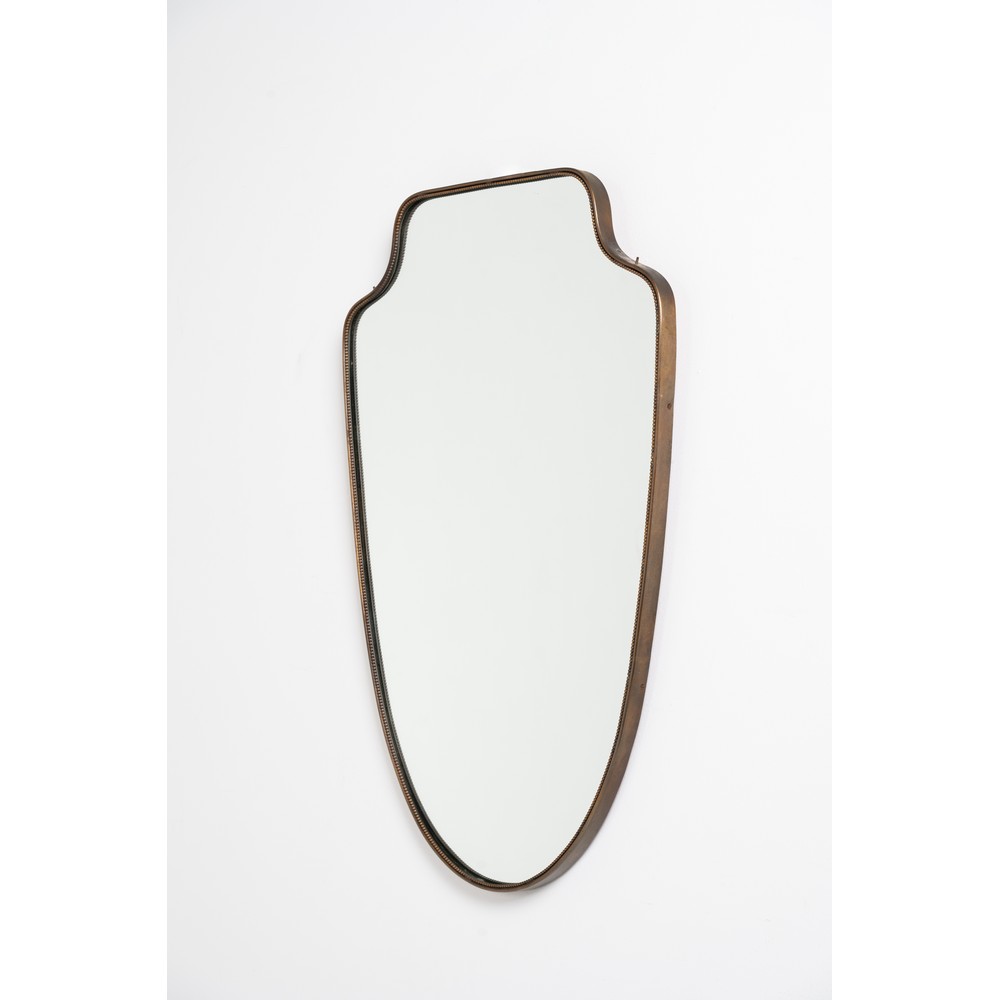 Specchio da parete con cornice in ottone, cristallo specchiato, corpo a scudo con angoli curvati, cimasa a due movimenti.