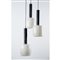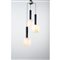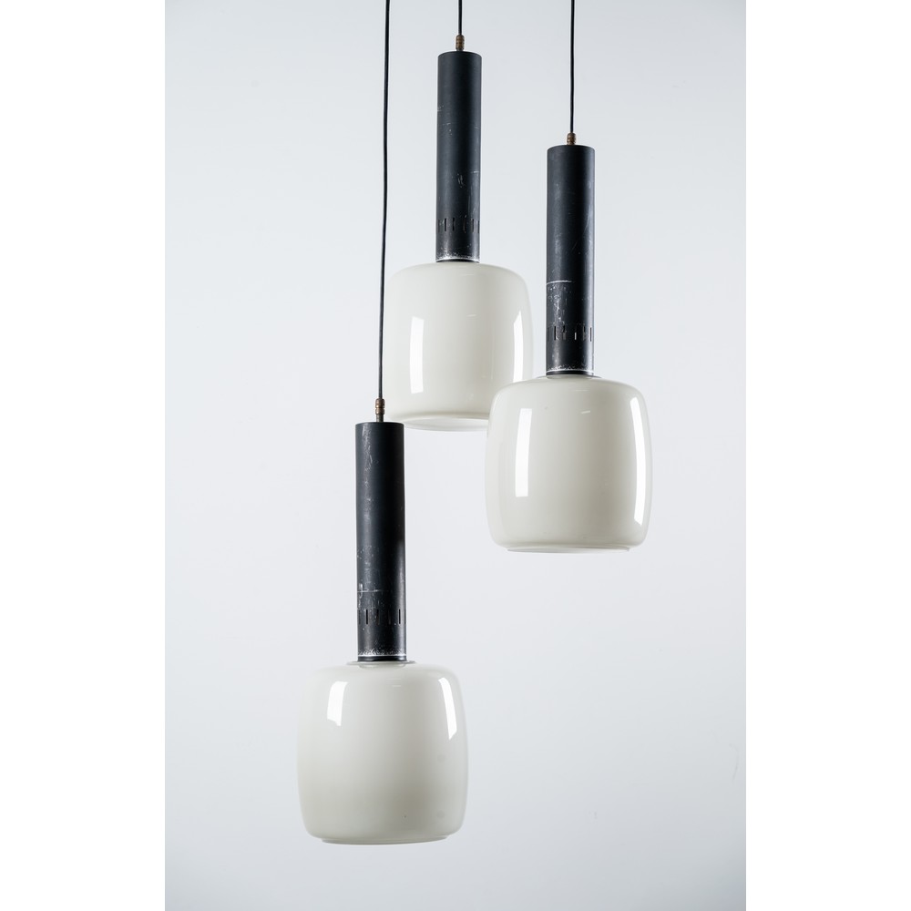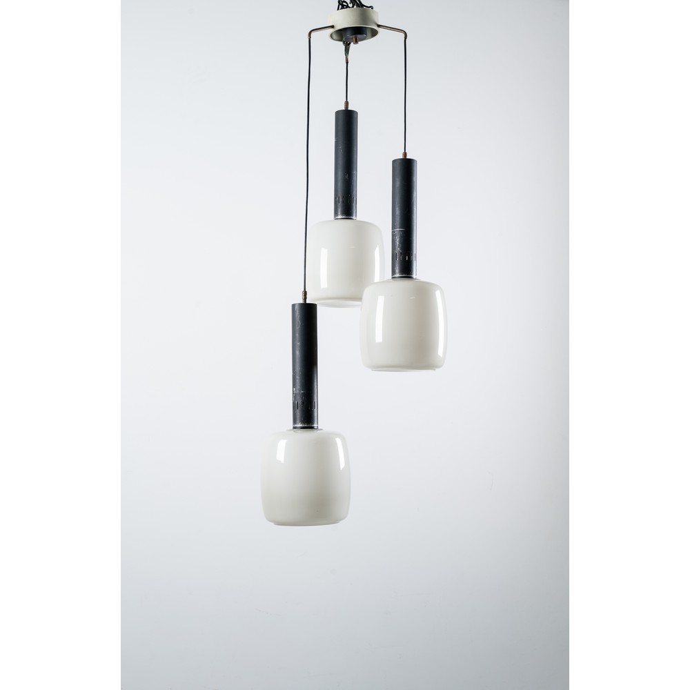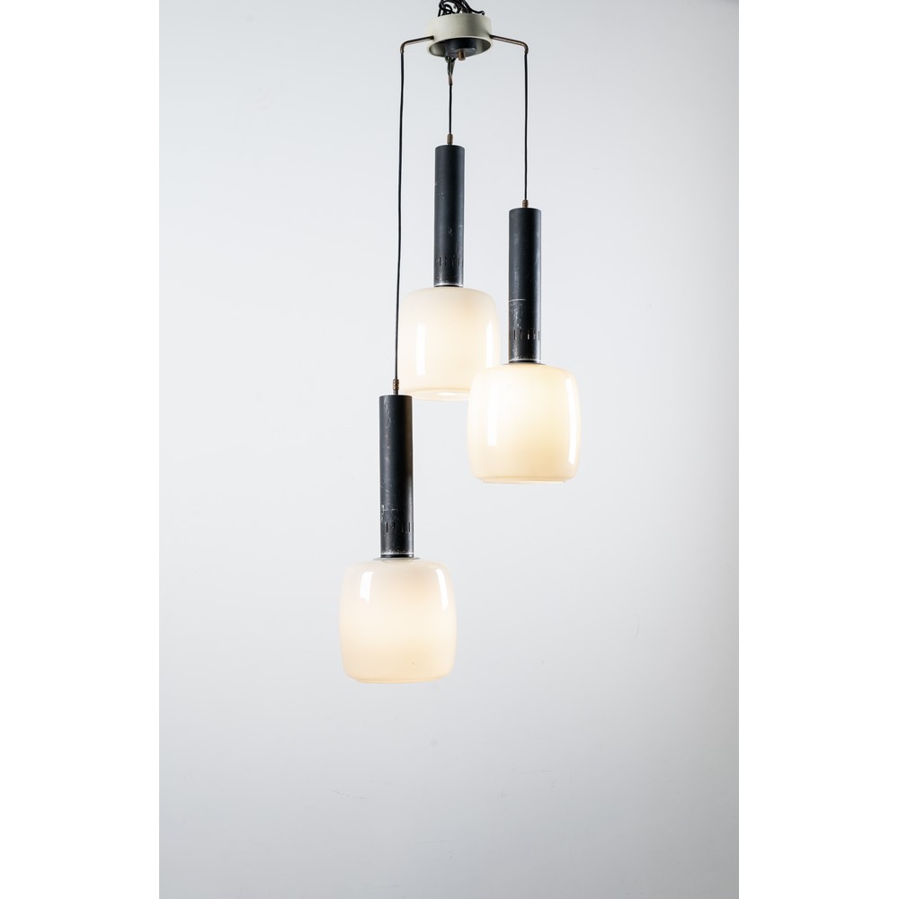 Lampada a sospensione a tre luci, struttura in metallo verniciato nero con diffusori ovalizzati in vetro opalino. Segni di uso.