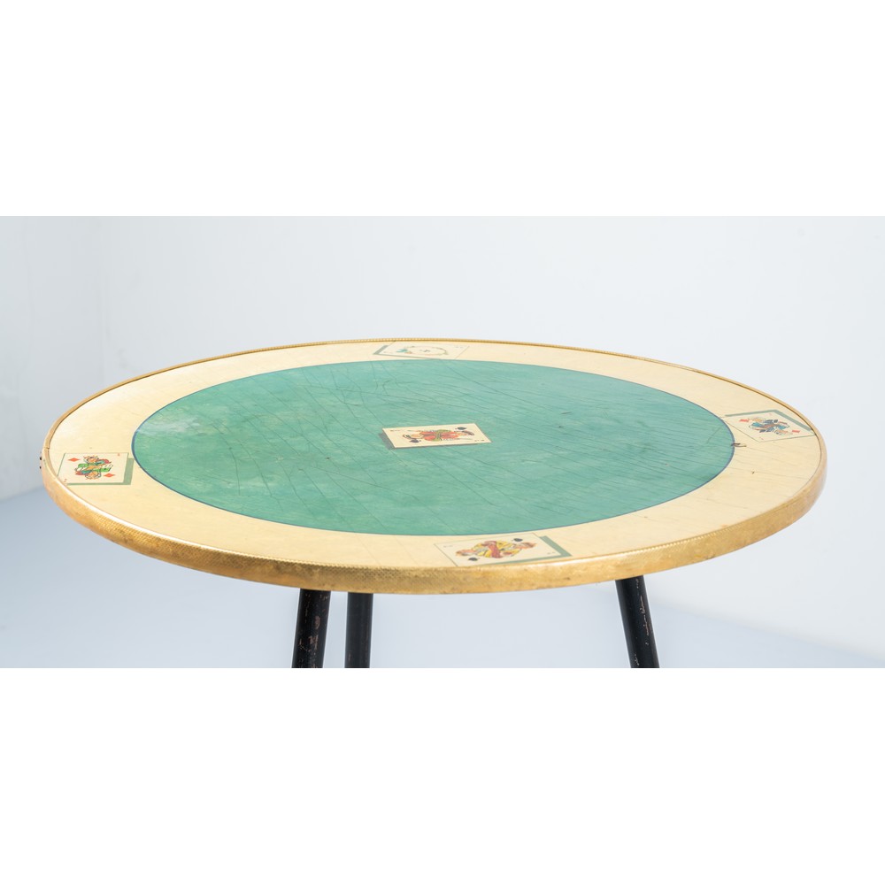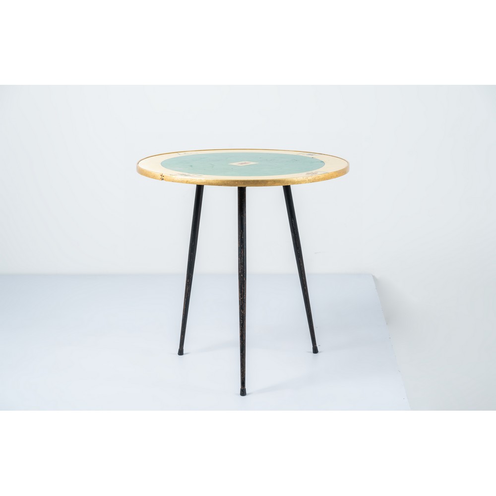 Tavolo da gioco con piano circolare in pergamena decorato con carte da gioco, piede tripode in legno laccato nero, cornice in metallo dorato. Difetti e segni di uso.