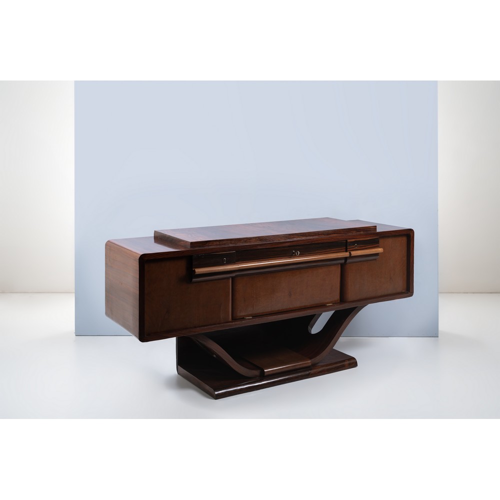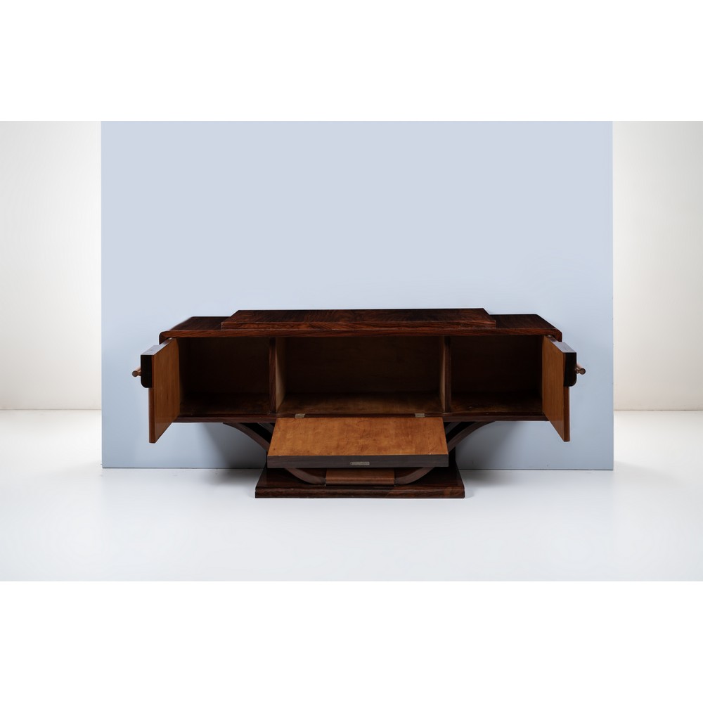 Sideboard in legno e radica di noce, piano rettangolare, sul fronte tre cassetti, due vani chiusi con anta battente ed un vano chiuso con anta a ribalta, sostegno inferiore curvato, piede rettangolare.