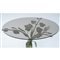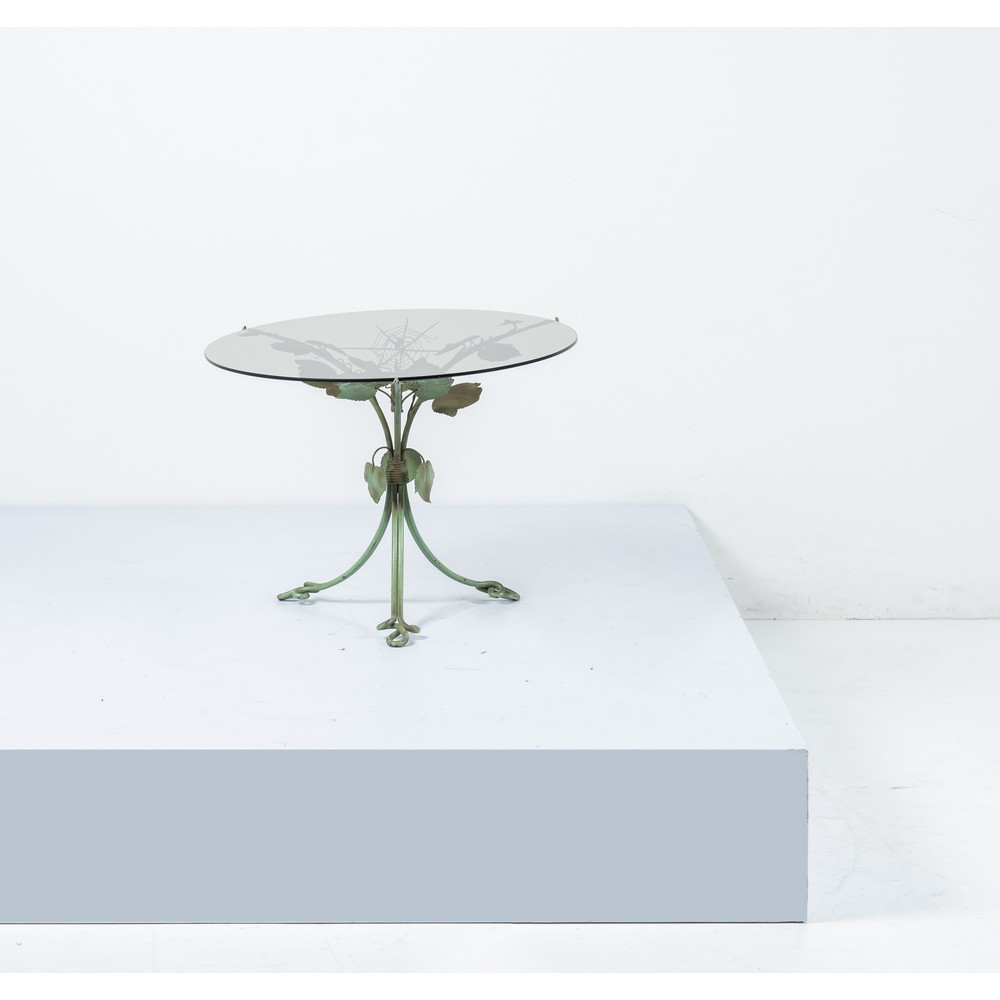 Tavolo occasionale con struttura in ferro battuto, forgiato e laccato verde, struttura a tralci vegetali con ragnatela e ragno, piano circolare in vetro trasparente.