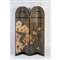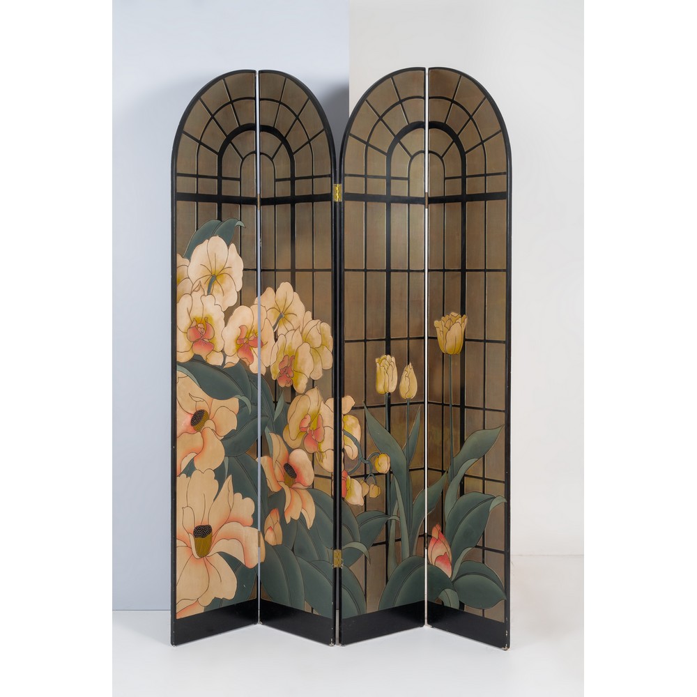 Paravento composto da quattro pannelli in legno laccato nero e dipinto su fondo oro con grandi fiori di loto crema e rosa, foglie verdi. Lievi segni di uso alla base.