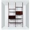 Libreria a giorno cielo-terra in legno esotico, composta da tre montanti telescopici, ripiani a giorno e due moduli a due sportelli battenti ed uno a ribalta. Guide e reggi mensole in alluminio.